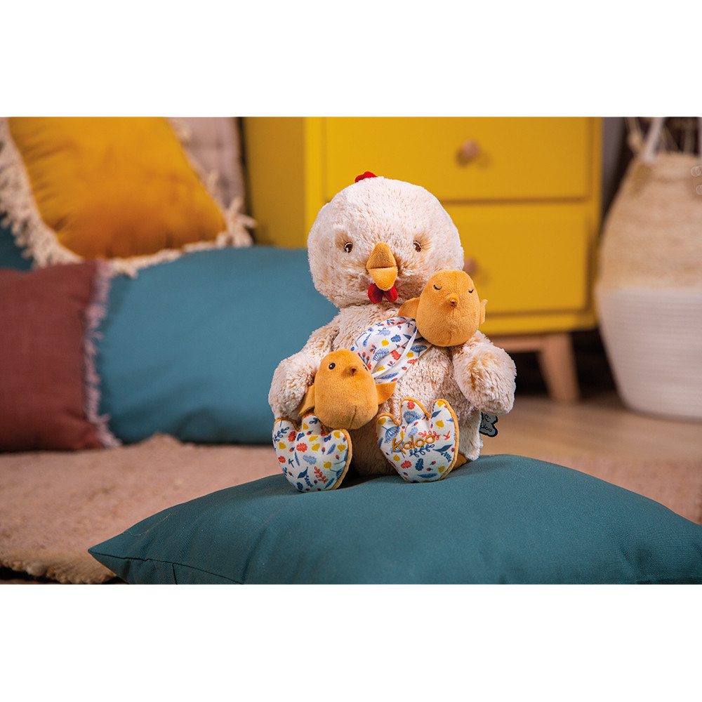 This plush with baby reinterprets the parent-child close relationship in a sweet and tender way. Paul the Papa Rooster, a cuddly plush toy with soft cream fur, tenderly holds his chicks close in a muslin baby carrier with a lovely underbrush" print. Each chick has its own expression. As a strong symbol of parental instinct and love, this animal with a soft and protective character represents parenthood in all its glory. Using this symbol, children can make-believe they are parents and celebrate parent-infant attachment bonds. Presented in a beautiful giftbox. From birth onwards.