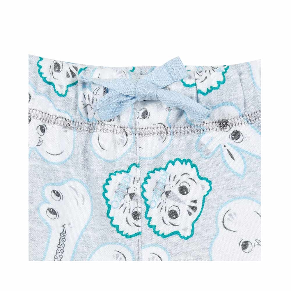 Super cute organic cotton jersey shorts for baby boys by Kenzo Kids, with an elasticated drawstring waist. They have a blue and green Mini Tiger & Friends print on a grey background.- 100% organic cotton jersey (soft & stretchy)