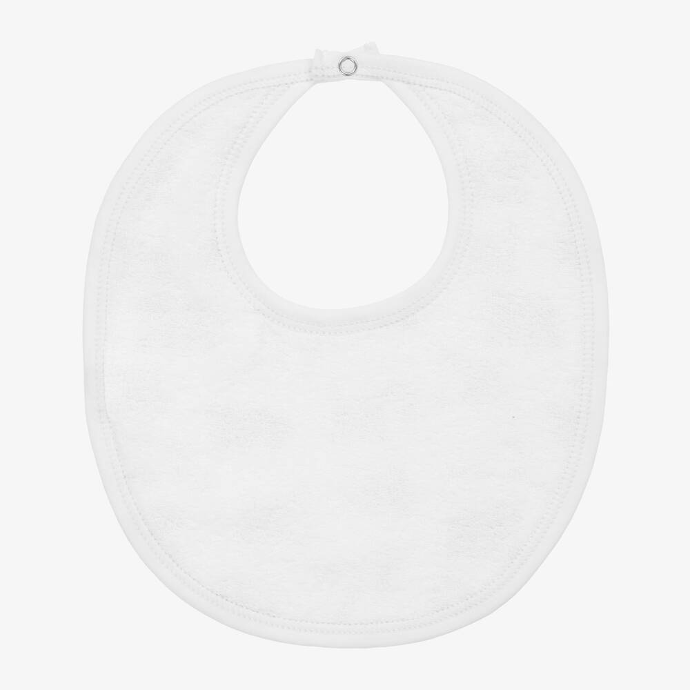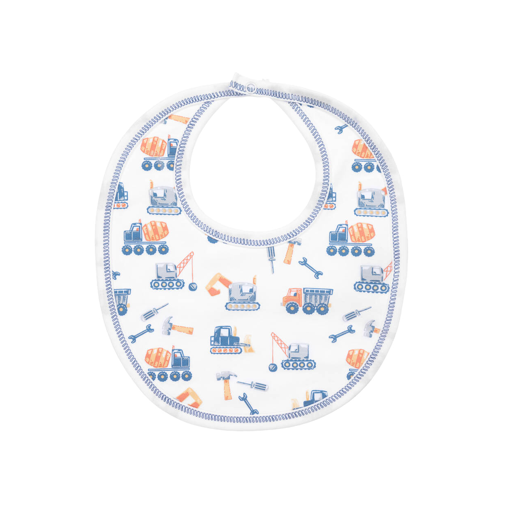 White bib for baby boys by Kissy Kissy, made in soft Pima cotton jersey. Lined in gentle cotton towelling for absorbency, this useful feeding accessory is ideal for catching dribble and spills. It fastens with a popper on the back of the neck, and is patterned with playful construction vehicles and tools.