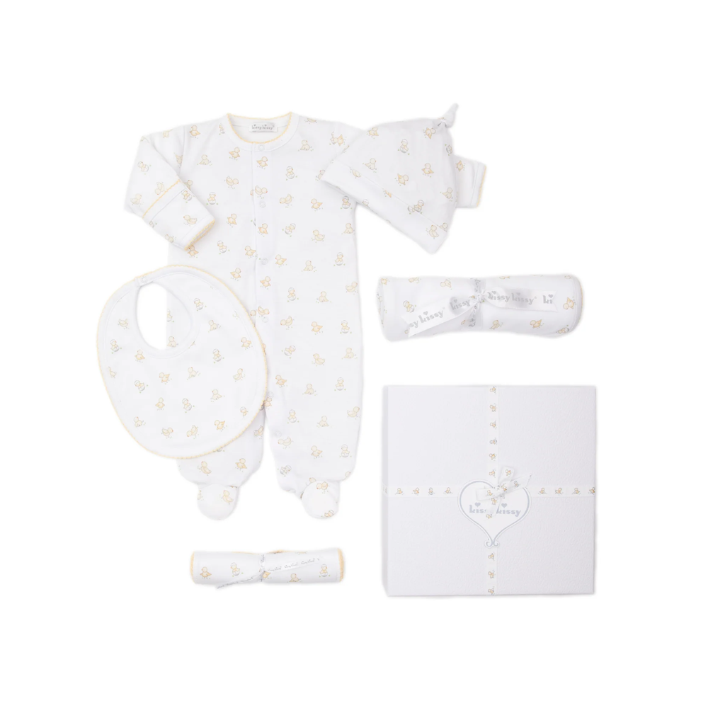 Welcome baby home with this 100% Pima cotton, Kissy Kissy favorite: Hatchlings Collection print gift set. This 5-piece take me home gift set includes a footie for sleep or play with a matching cozy hat, a bib & burp cloth and a coordinating, softer than softer heirloom quality blanket. All items are elegantly folded and placed in our branded gift box, wrapped in printed ribbon detail.