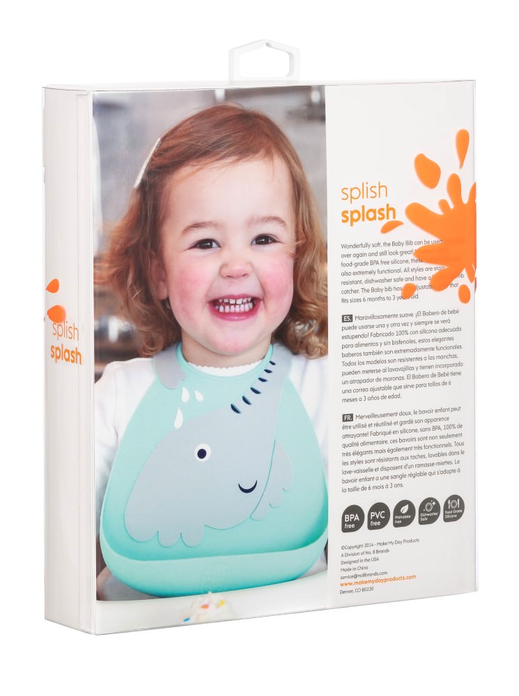 All styles are stain resistant, dishwasher safe and have a built-in crumb catcher. The Baby Bib has an adjustable strap that fits sizes 6 months to 3 years old.