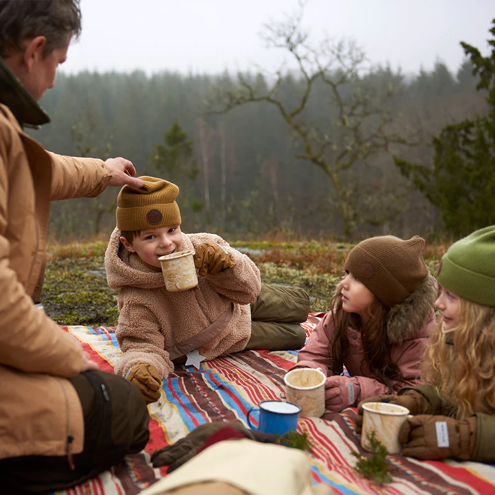 Beanie from MINI A TURE in rib-knitted Italian merino wool with a MINI A TURE logo in the front of the beanie.