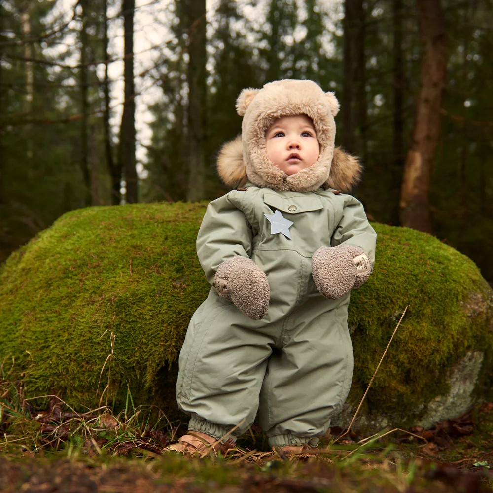 Classic winter hood from MINI A TURE for the little ones. The hood is made of soft, fluffy fleece in recycled polyester, which feels gentle and luxurious against the skin. The hood fastens with a button under the chin and features adorable little ears.