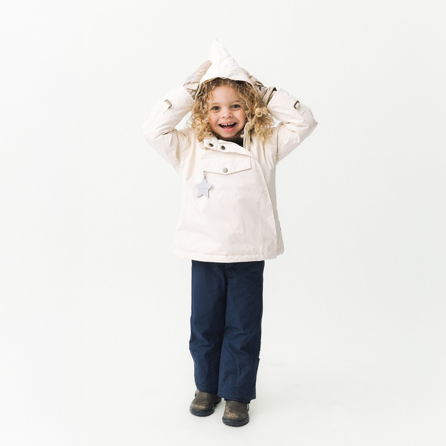 Iconic MINI A TURE winter jacket with 10-year guarantee. Wind- and waterproof, breathable, and tested to keep warm down to -25 degrees Celsius. The jacket opens at the front by a hidden, slanted zipper and has a soft fleece lining. Featuring a detachable hood that can be adjusted with an elastic string to keep the wind out. The sleeves have improved fitting securing the freedom to move as well as snow cuffs at the wrists with thumb opening. The waist is adjustable from the inside with an elastic. Sizes up to and including 86cm/18m have a rib around the neck, while the larger sizes have a regular collar. MINI A TURE signature reflex star in the front pocket.