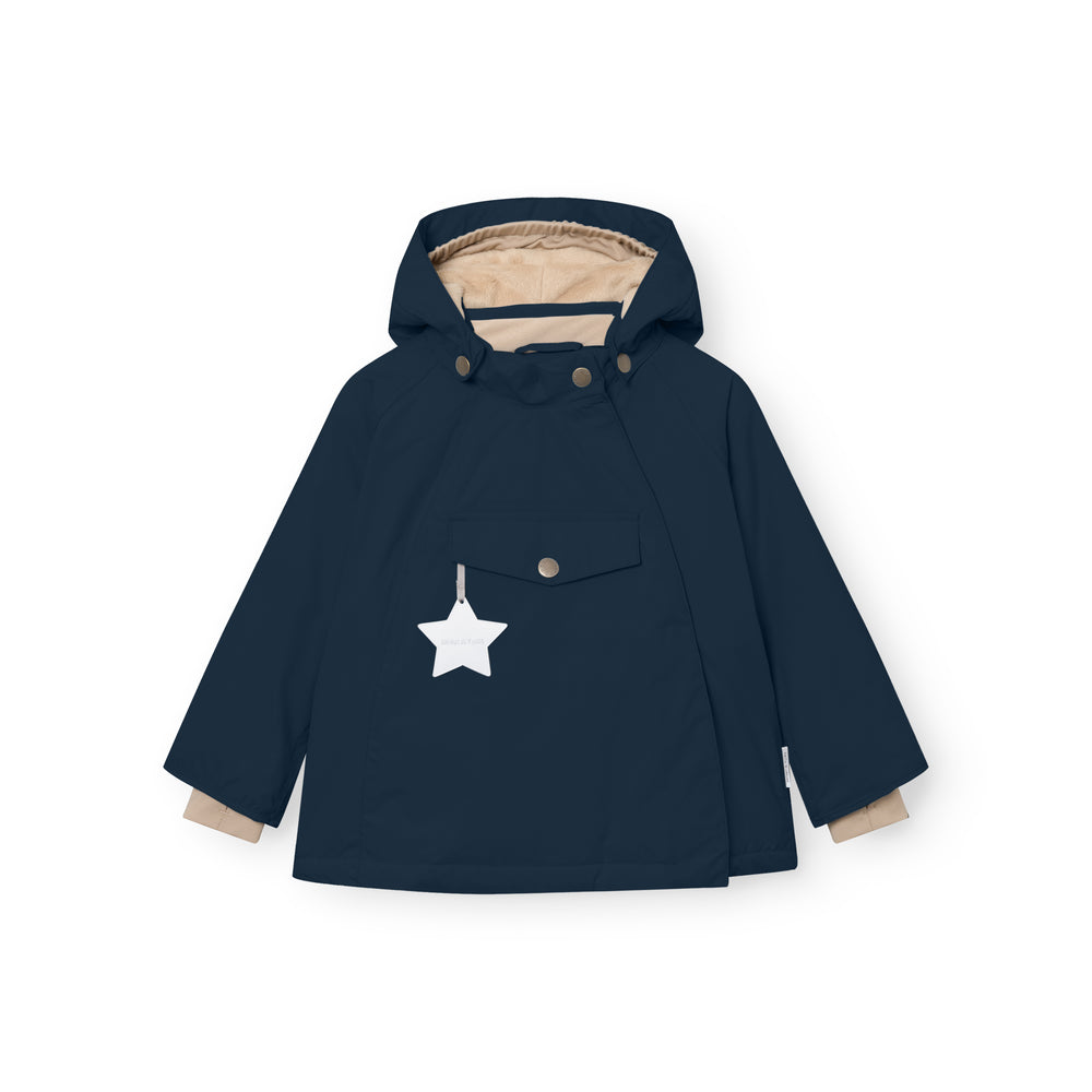 Iconic MINI A TURE winter jacket with 10-year guarantee. Wind- and waterproof, breathable, and tested to keep warm down to -25 degrees Celsius. The jacket opens at the front by a hidden, slanted zipper and has a soft fleece lining. Featuring a detachable hood that can be adjusted with an elastic string to keep the wind out. The sleeves have improved fitting securing the freedom to move as well as snow cuffs at the wrists with thumb opening. The waist is adjustable from the inside with an elastic. Sizes up to and including 86cm/18m have a rib around the neck, while the larger sizes have a regular collar. MINI A TURE signature reflex star in the front pocket.