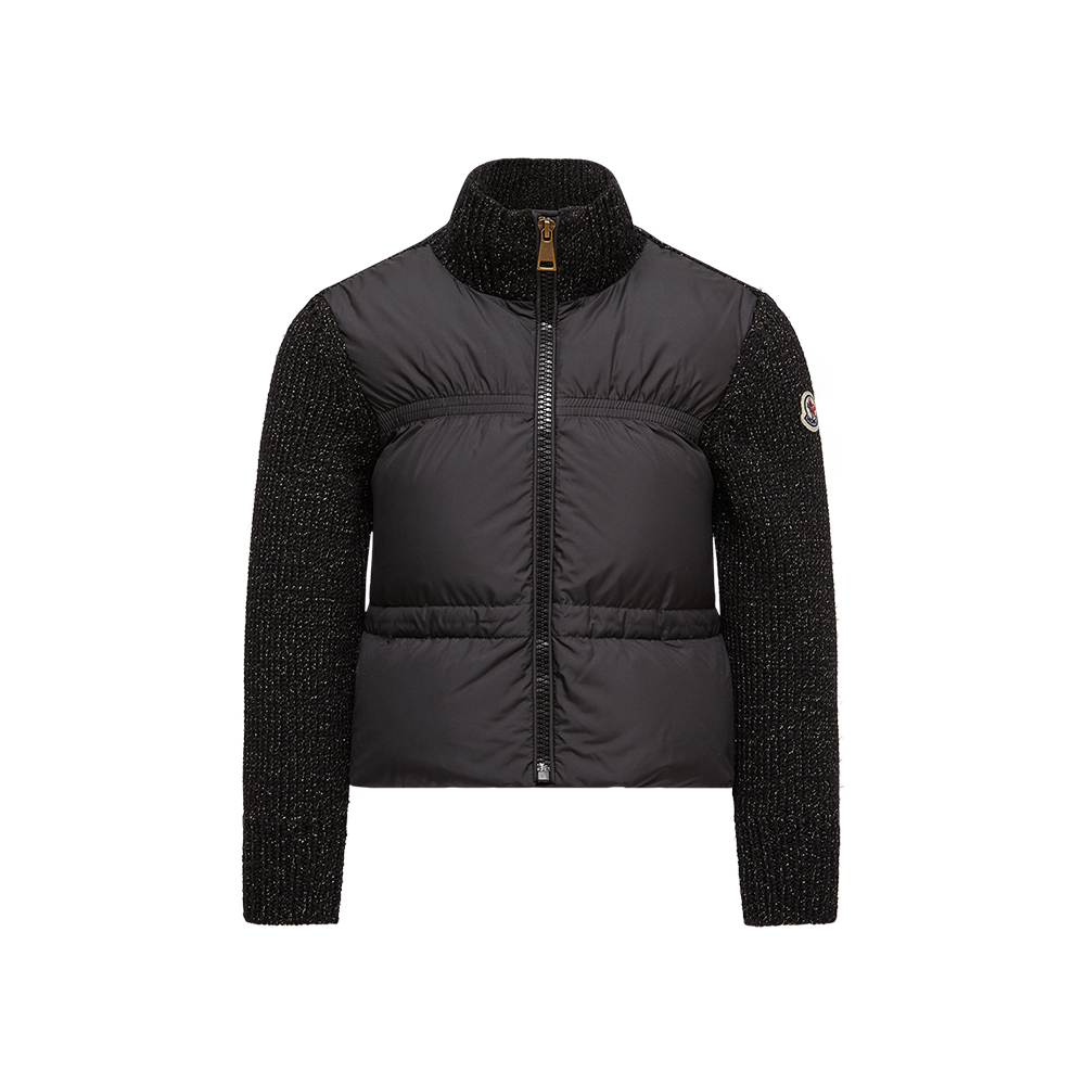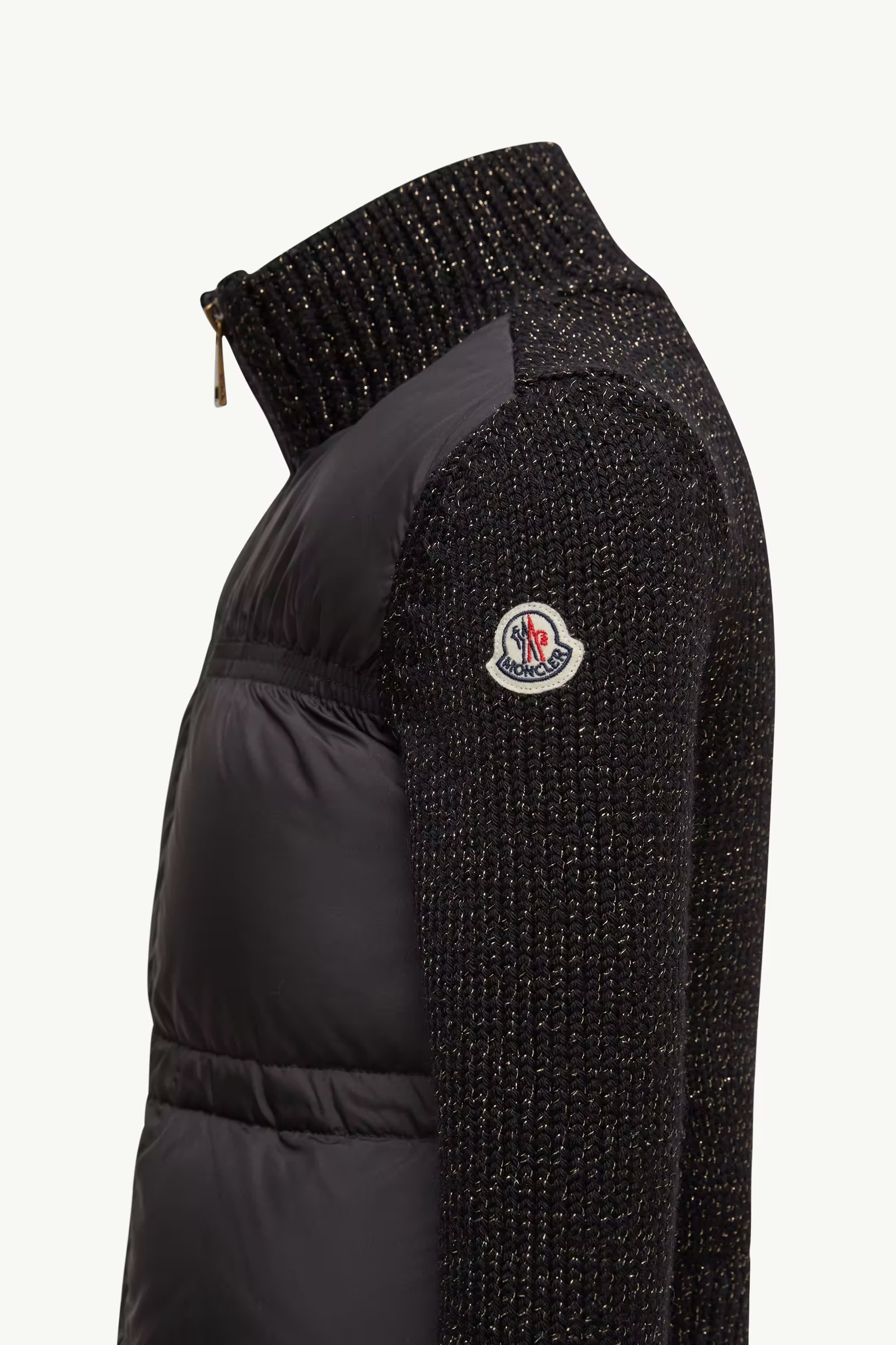 Easily worn in different temperatures, this wool cardigan is enhanced with a down-filled front. A sparkling finish adds a fun twist.