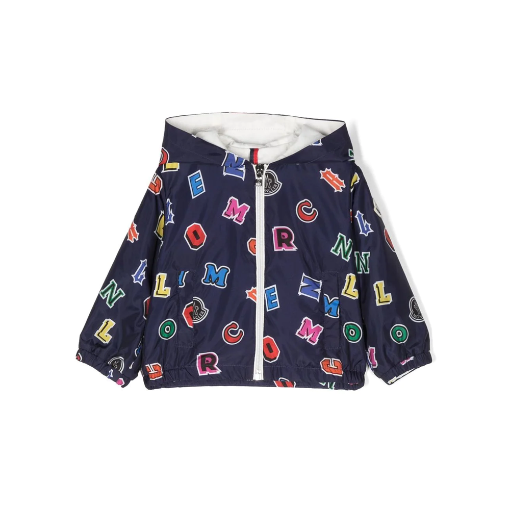 New season Moncler Enfant hooded rain jacket with all-over logo print.