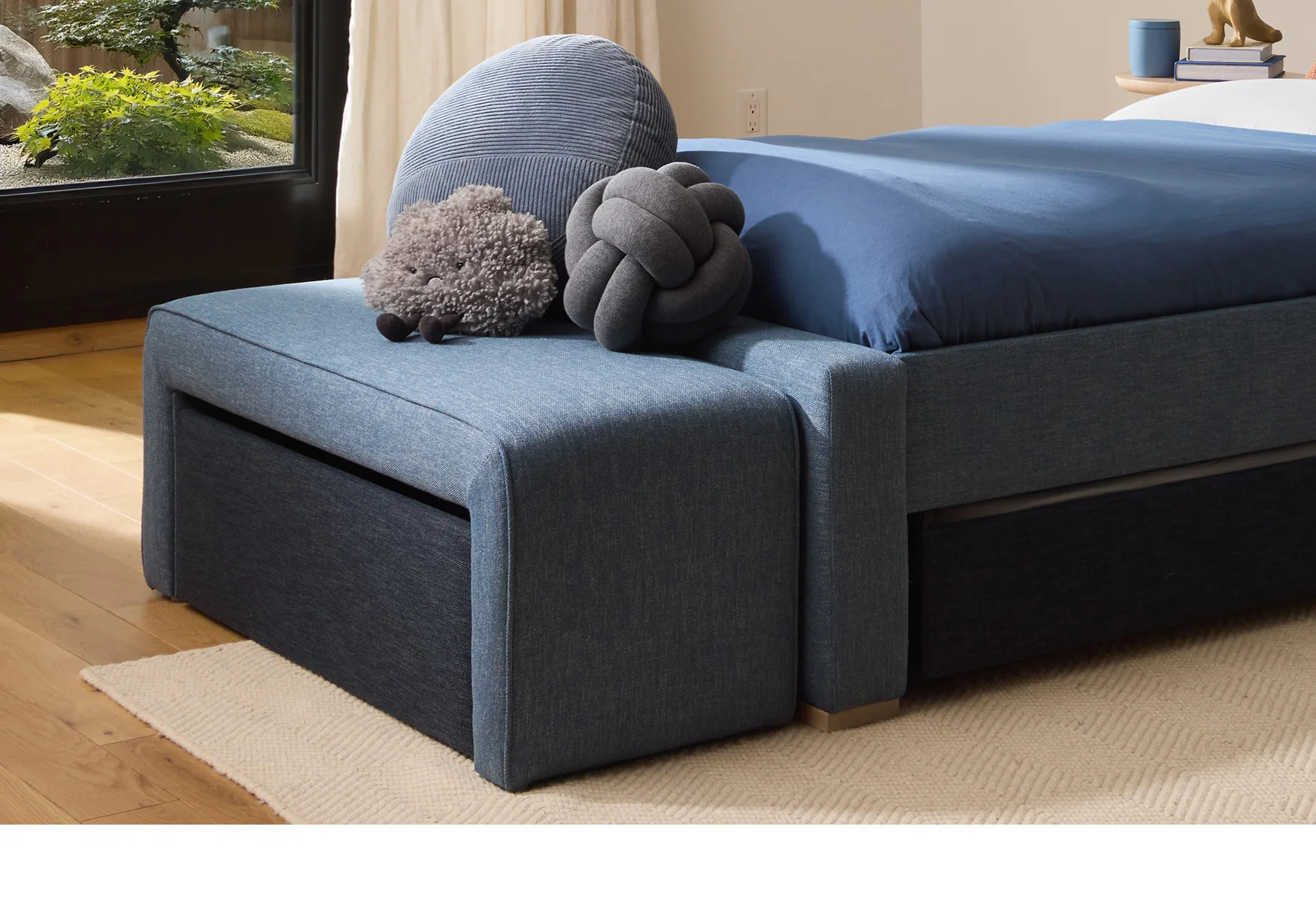 - Optional pull-out storage is upholstered & lightly padded; store toys, blankets, books, etc.