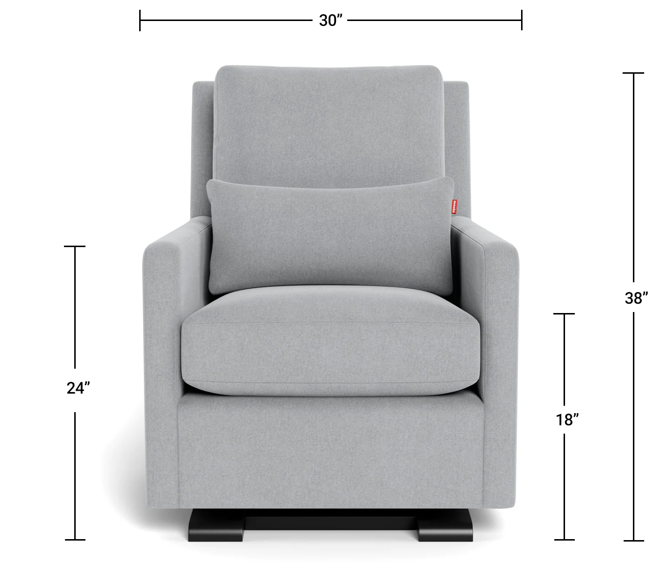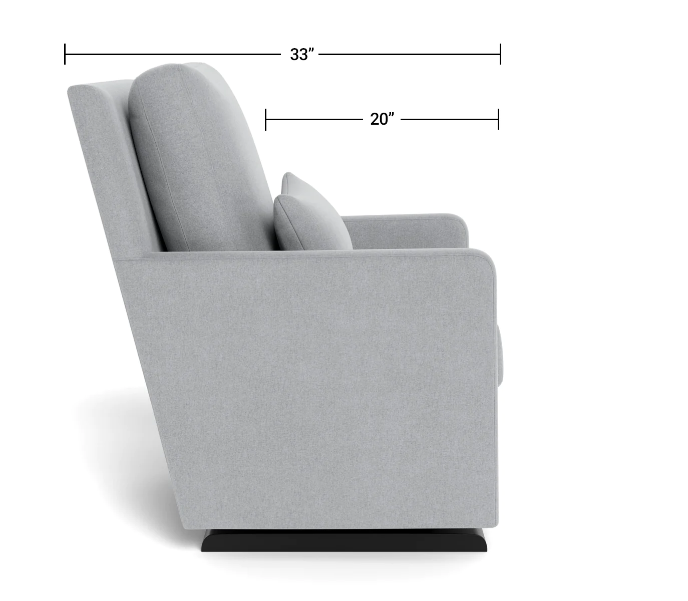 Overall Height: 38" Overall Width: 30" Overall Stationary Depth: 33" Seat Height: 18" Seat Width: 23" Seat Depth: 20" Back Height (from top of seat to top of chair): 25" Arm Height (from floor): 24" Distance from wall needed for gliding: 6" – 8" Product Weight: 80 lbs Box Size: 30" L x 31" W x 40" H Boxed Weight: 90 lbs.