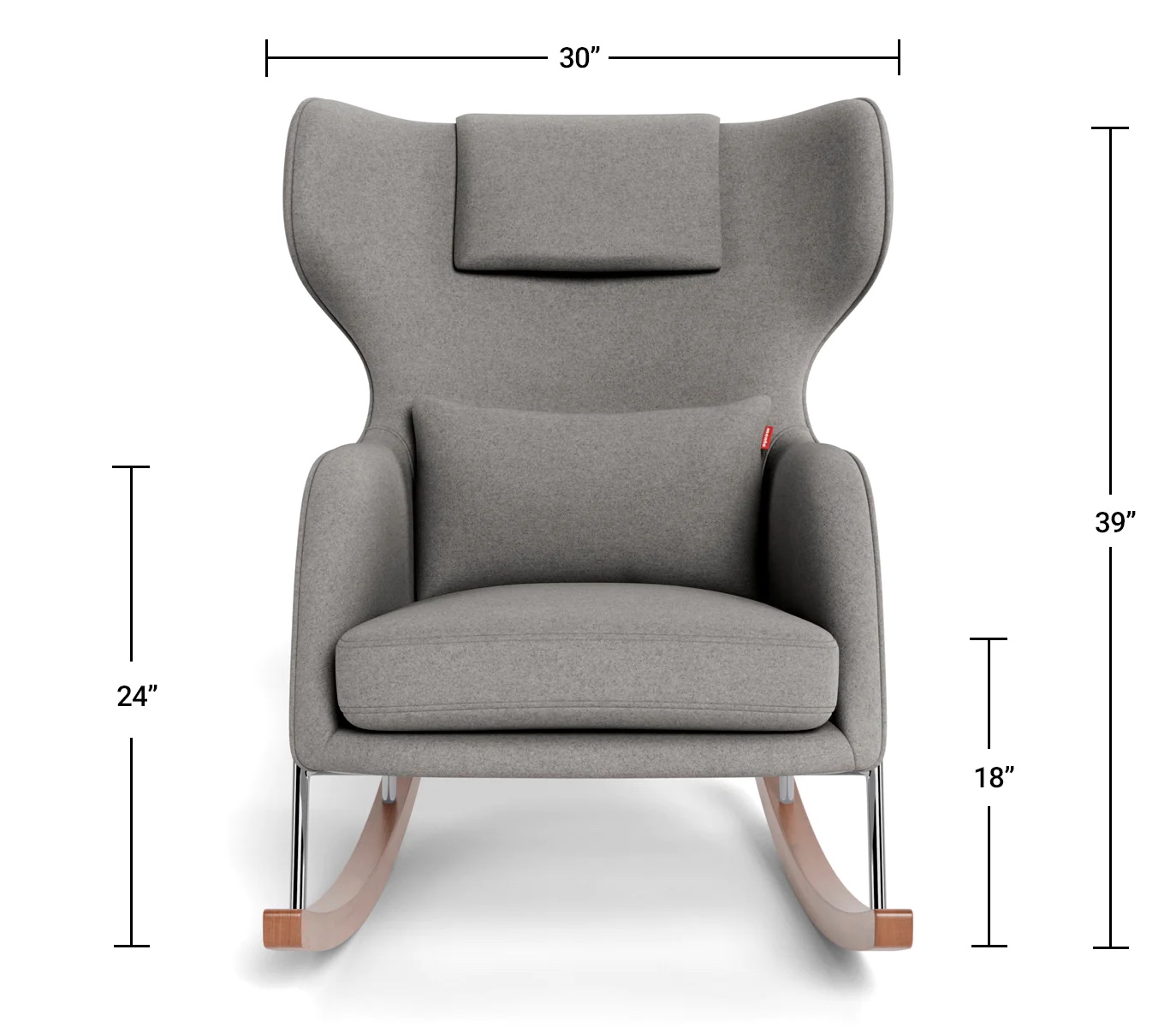 Overall Height: 39" Overall Width: 30" Overall Stationary Depth: 35" Seat Height: 18" Seat Width: 21" Seat Depth: 23" Back Height (from top of seat to top of chair): 26" Arm Height (From Floor): 24" Distance from wall needed for rocking: 6" – 8" Product Weight: 55 lbs. Box Size: 35" L x 32" W x 40" H Boxed Weight: 65 lbs.