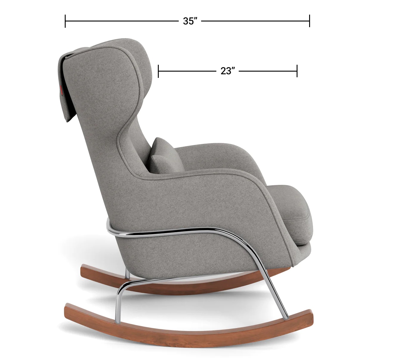 Our Grand Jackson is a purposefully designed wingback with striking curves and smooth rocking comfort. Its combination of solid walnut wood, metal legs and sumptuous fabric choices, along with its stunning silhouette, make this rocker a sculptural statement piece for your home. Rest your head and Rock On in this unique wingback.