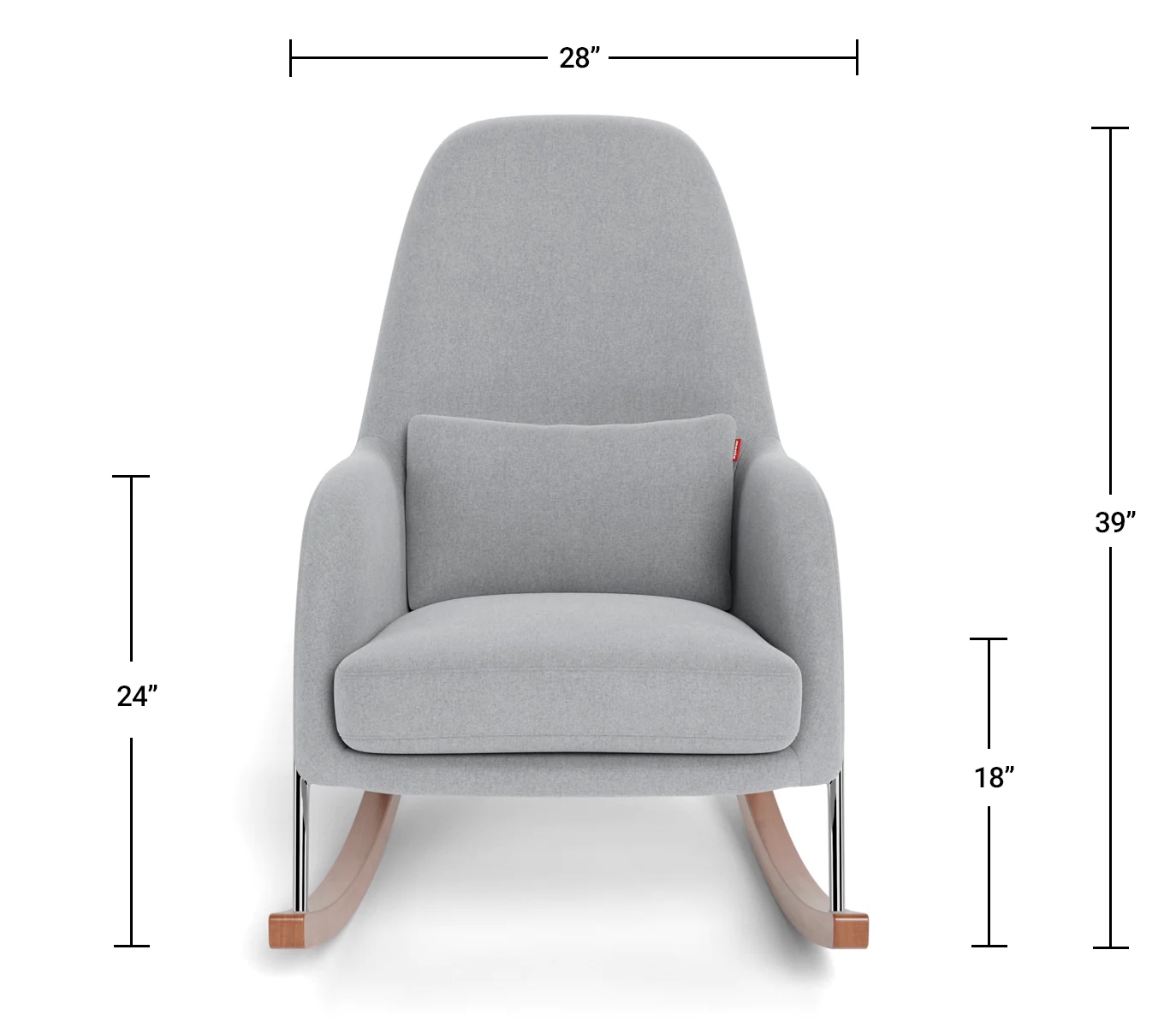 Overall Height: 39" Overall Width: 28" Overall Stationary Depth: 35" Seat Height: 18" Seat Width: 21" Seat Depth: 21" Back Height (from top of seat to top of chair): 28" Arm Height (From Floor): 24" Distance from wall needed for rocking: 6" – 8" Product Weight: 50 lbs. Box Size: 28" L x 34" W x 40" H Boxed Weight: 60 lbs.