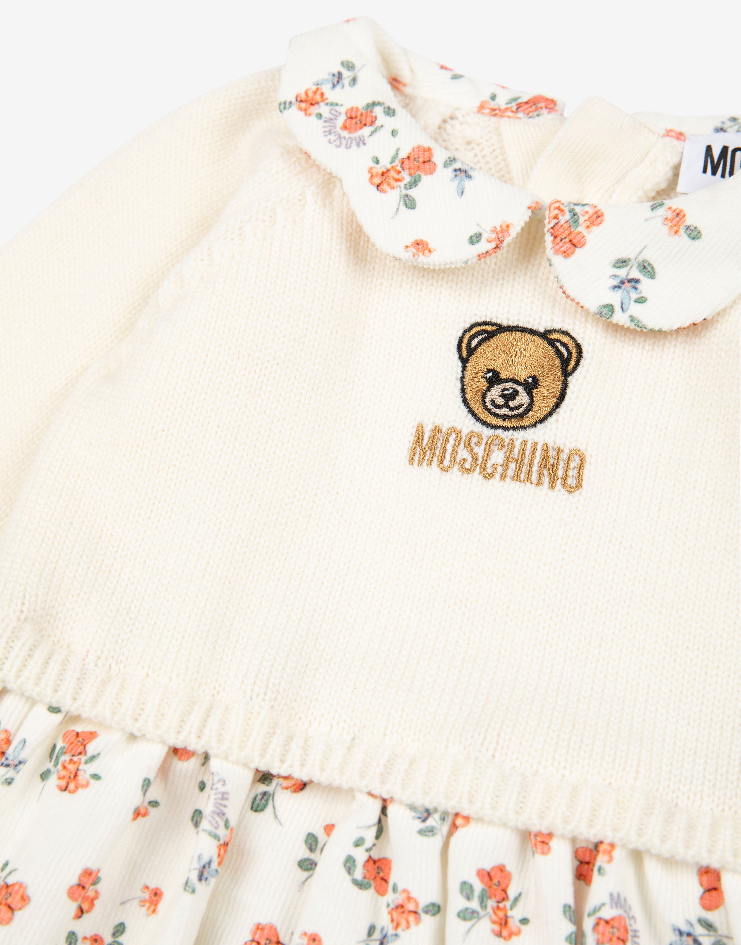 Pretty ivory dress for little girls by Moschino, with the iconic Teddy Bear logo embroidered on the chest in gold. With the look of a two piece, it combines a super soft, knitted bodice with a scalloped corduroy collar patterned in sweet orange and blue flowers.