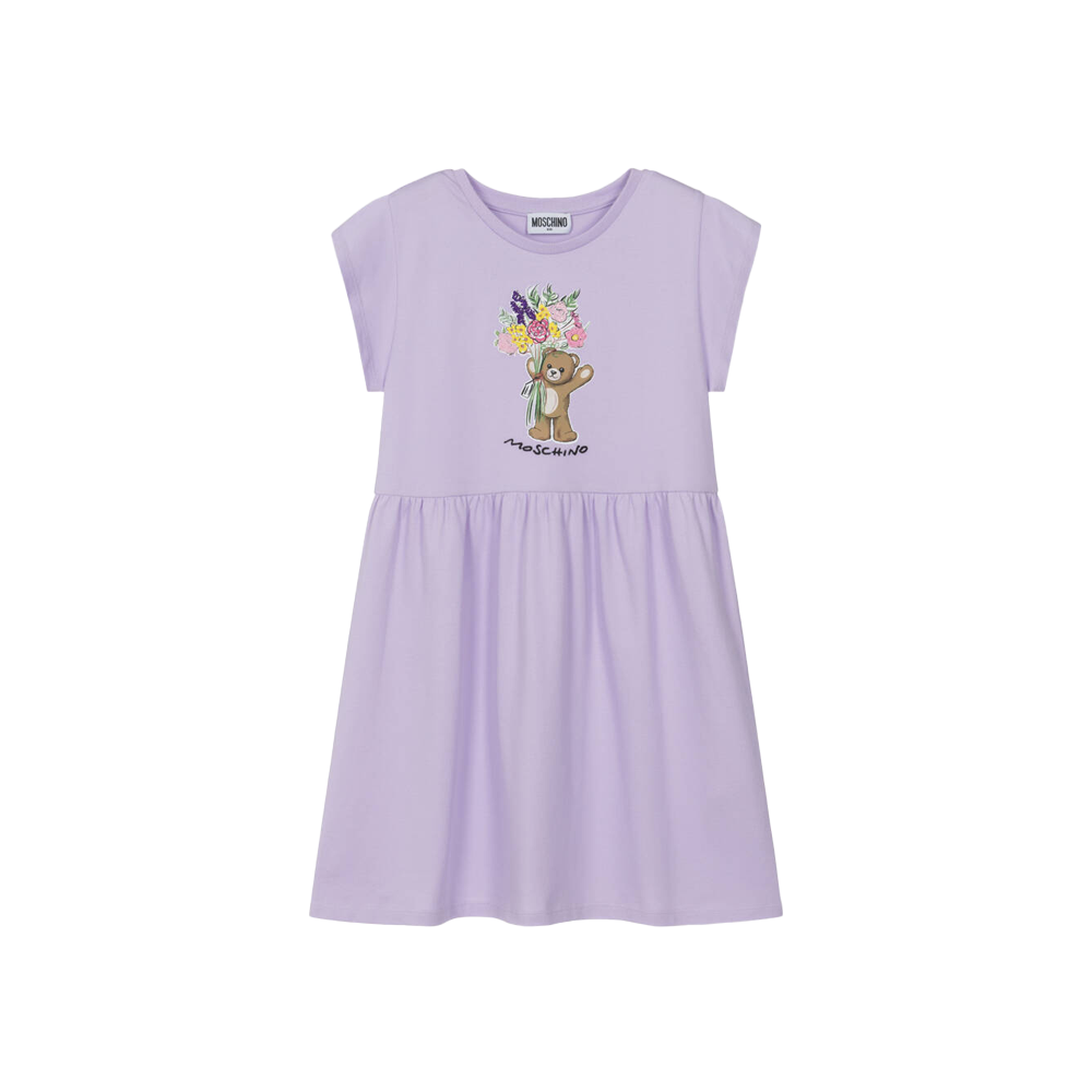Lilac purple dress for girls by Moschino, made in soft cotton piqué. This casual, loose-fitting style has a ribbed crew neckline and a full, gathered skirt. The brand's signature Teddy Bear features on the front holding a bunch of pretty, embroidered flowers with a black embroidered logo below.