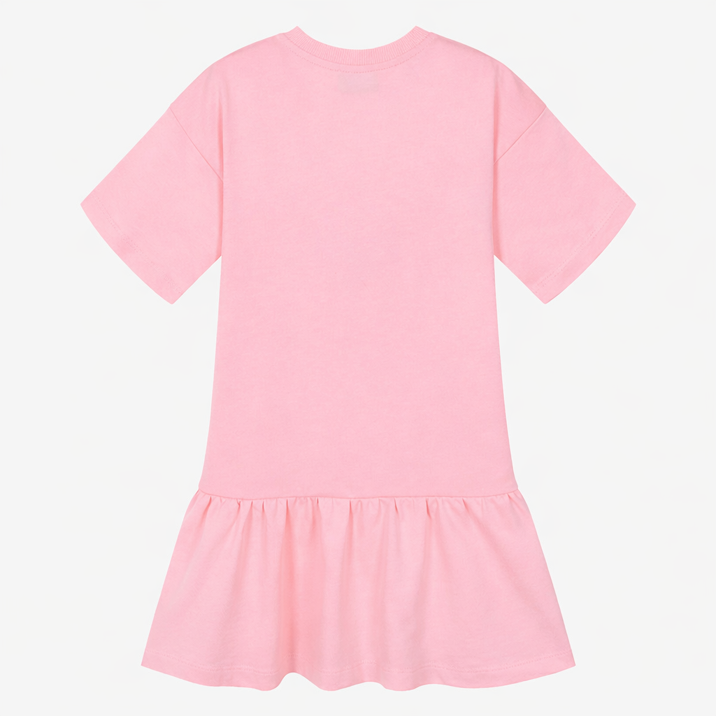 Pink cotton dress for girls by Moschino, with the brand's Moschino Teddy Bear logo for an instantly recognisable look. Made in soft, comfortable jersey, it has a casual T-shirt style with dropped shoulders and a drop-waisted, gathered skirt.