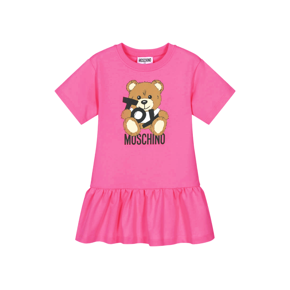 This charming bright pink dress by Moschino is perfect for your little girl, showcasing the instantly recognizable Moschino Teddy Bear print front and center. Designed in a relaxed T-shirt style, it features a comfortable fit and a stylish dropped hem, making it both casual and fashionable for any occasion.