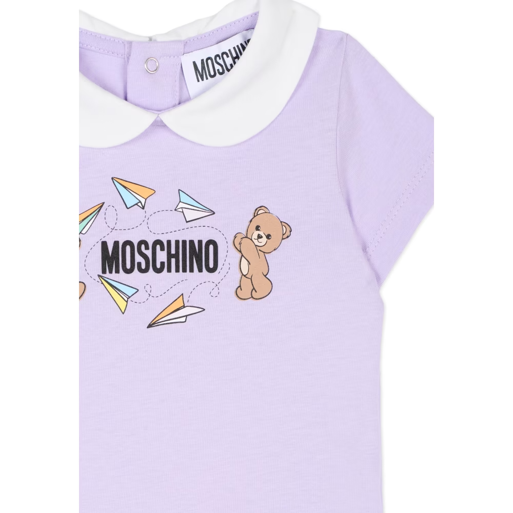 The Moschino Fly Bear Romper is a charming everyday essential designed with both comfort and signature Moschino style. Made from soft cotton jersey in a delicate lilac hue, it features a crisp white Peter Pan collar and an adorable Teddy Bear and paper plane print across the chest with the brand’s logo. With snap button closures at the back and between the legs, dressing your little one is as easy as it is stylish.