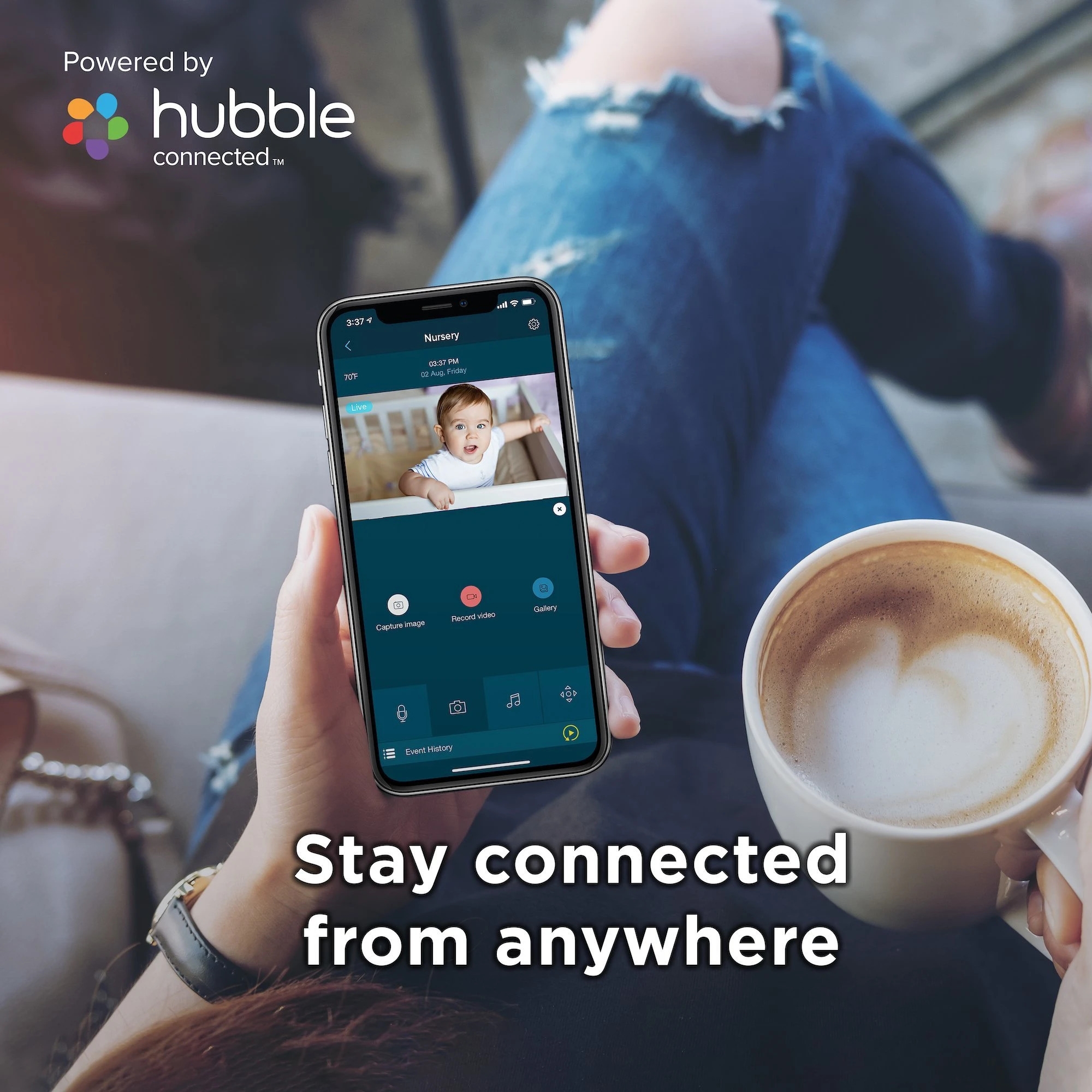 Through the downloadable Hubble for Baby app, keep track of your baby's growth and development, monitor feeding times and quantity, share videos via social media, or watch helpful parenting videos.
