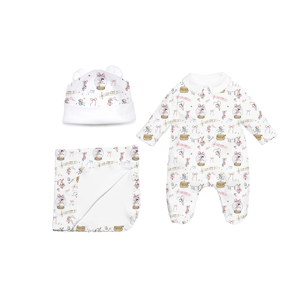 A babygrow set for baby girls by Ukrainian brand My Little Pie. Made from super soft organic Supima cotton, this set consists of babygrow with ruffled trims over the shoulders and fastens with poppers on the front and between legs for easy dressing. Matching blanket has scalloped embroidered trims around the edges. And hat with soft inner seams, it promises a gentle touch for both boys and girls, making them feel special from the start.