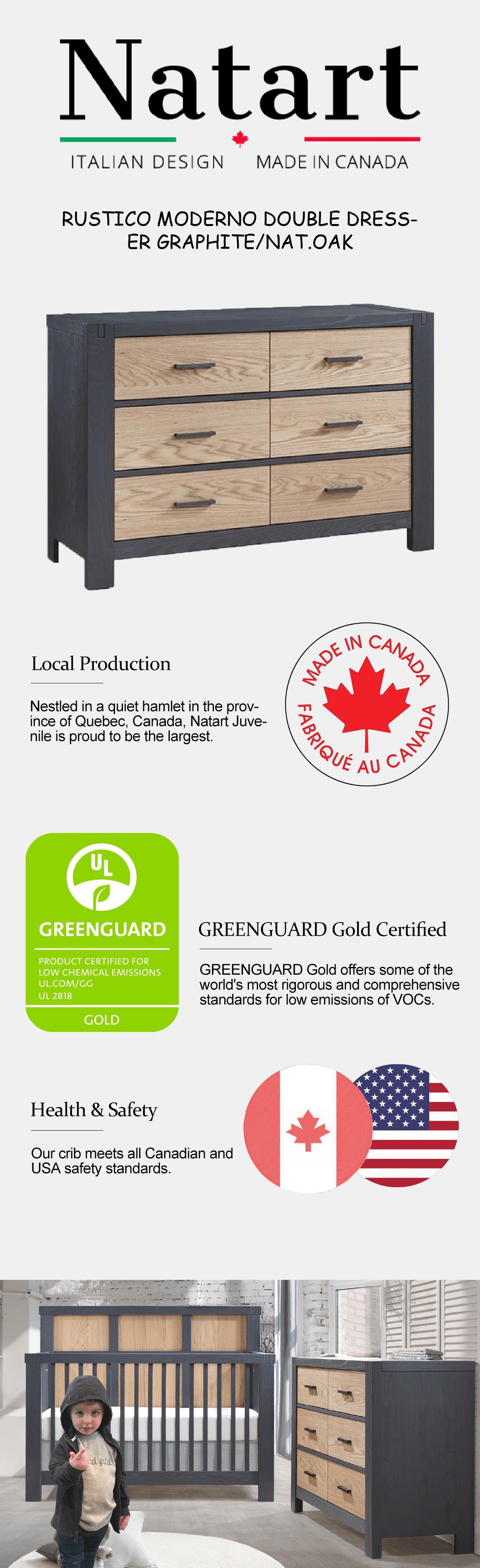 The Rustico Moderno “5-in-1” Convertible Crib is highlighted by chunky top moldings with an open mortise & tenon detail, an elegantly framed back panel and one-piece corner posts. It offers long term value with five configurations: crib, toddler bed, daybed, double bed headboard and complete double bed.