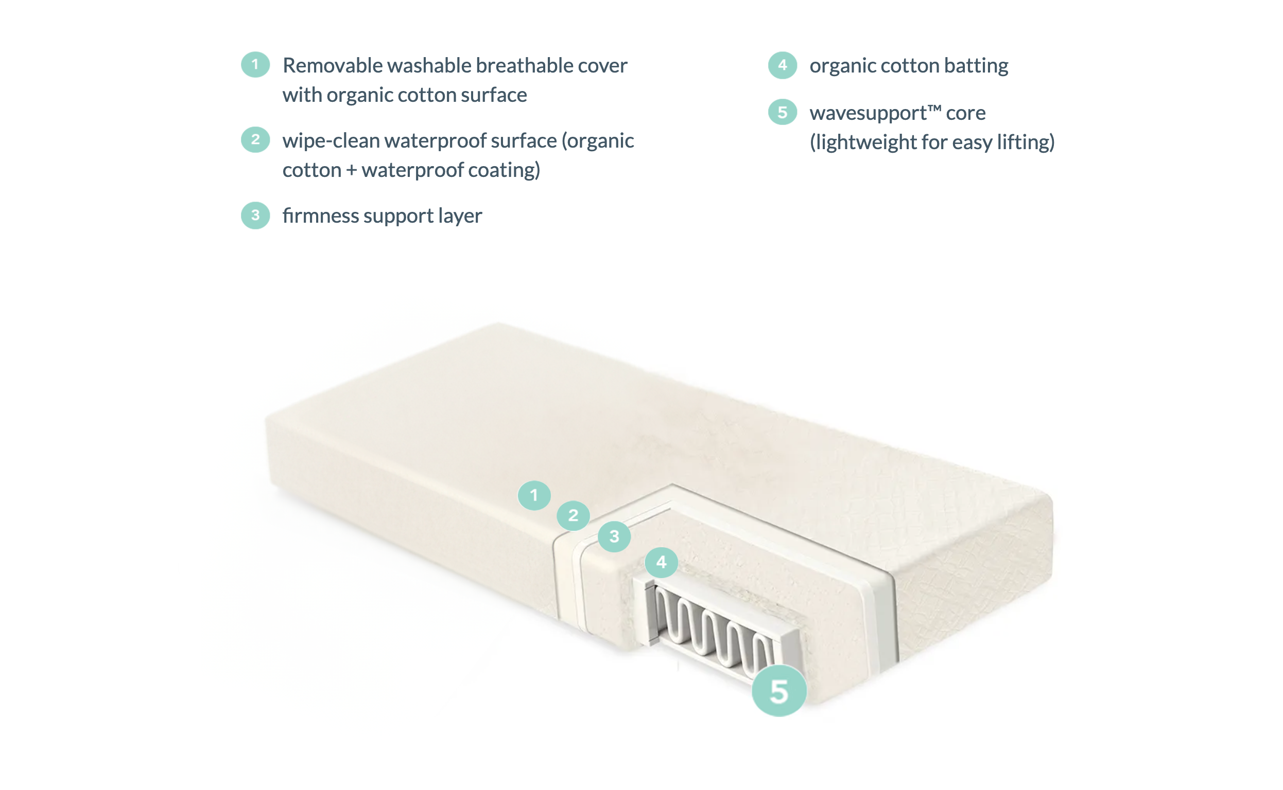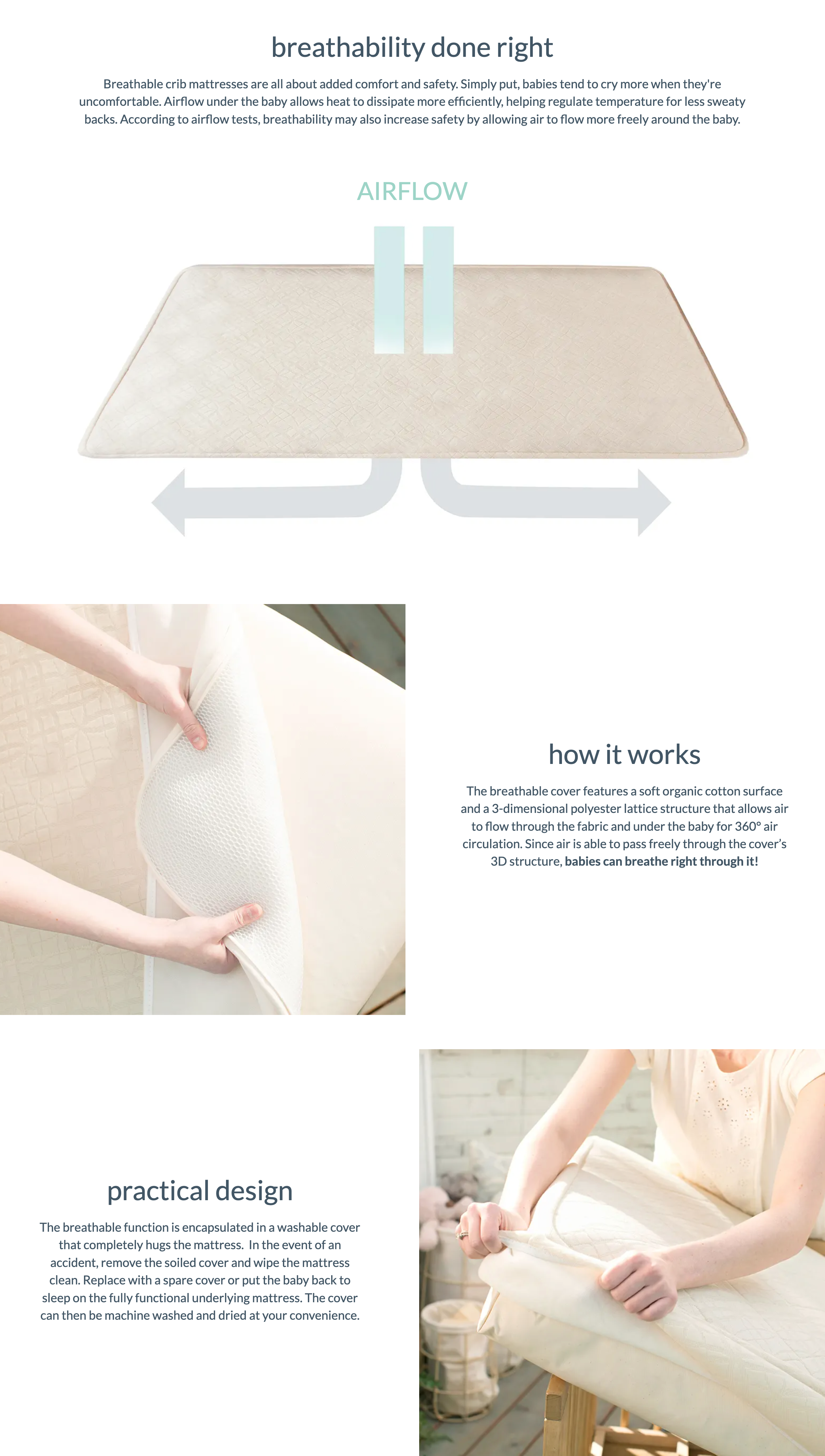 Featuring a luxurious designer finish, the Naturepedic Organic Breathable Ultra Baby Crib Mattress (2-Stage) combines breathability and waterproofing for a safer, healthier and more hygienic crib mattress design. The washable cover creates a breathable space under Baby, which improves temperature regulation and allows your little one to breathe right through the surface if necessary. No polyurethane foam, flame retardants, vinyl/PVC, phthalates or allergenic latex whatsoever.