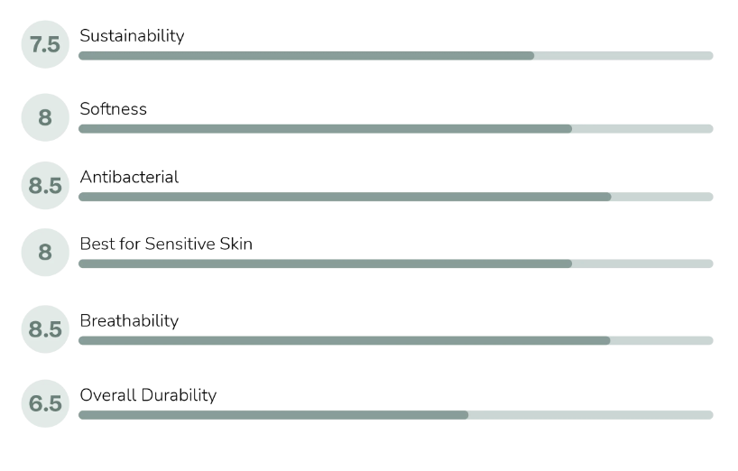 Each collection, we strive to innovate and use fabrics which are easier on the environment. To be more transparent with our customers, we've rated each of our garments according to several key factors so you know exactly what you are getting before you purchase. Here is our overall score for this garment made from our Bamboo Muslin: