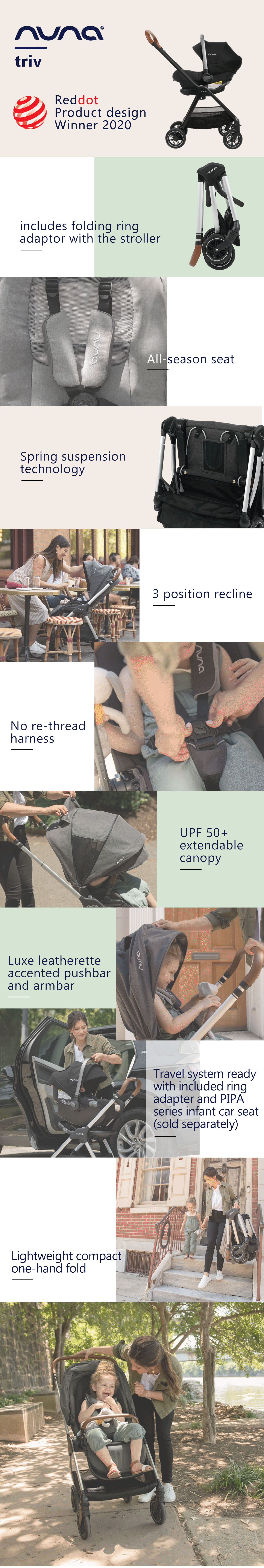 - Travel system ready. Simply attach a Nuna PIPA series infant car seat (sold separately) to the included ring adaptor.