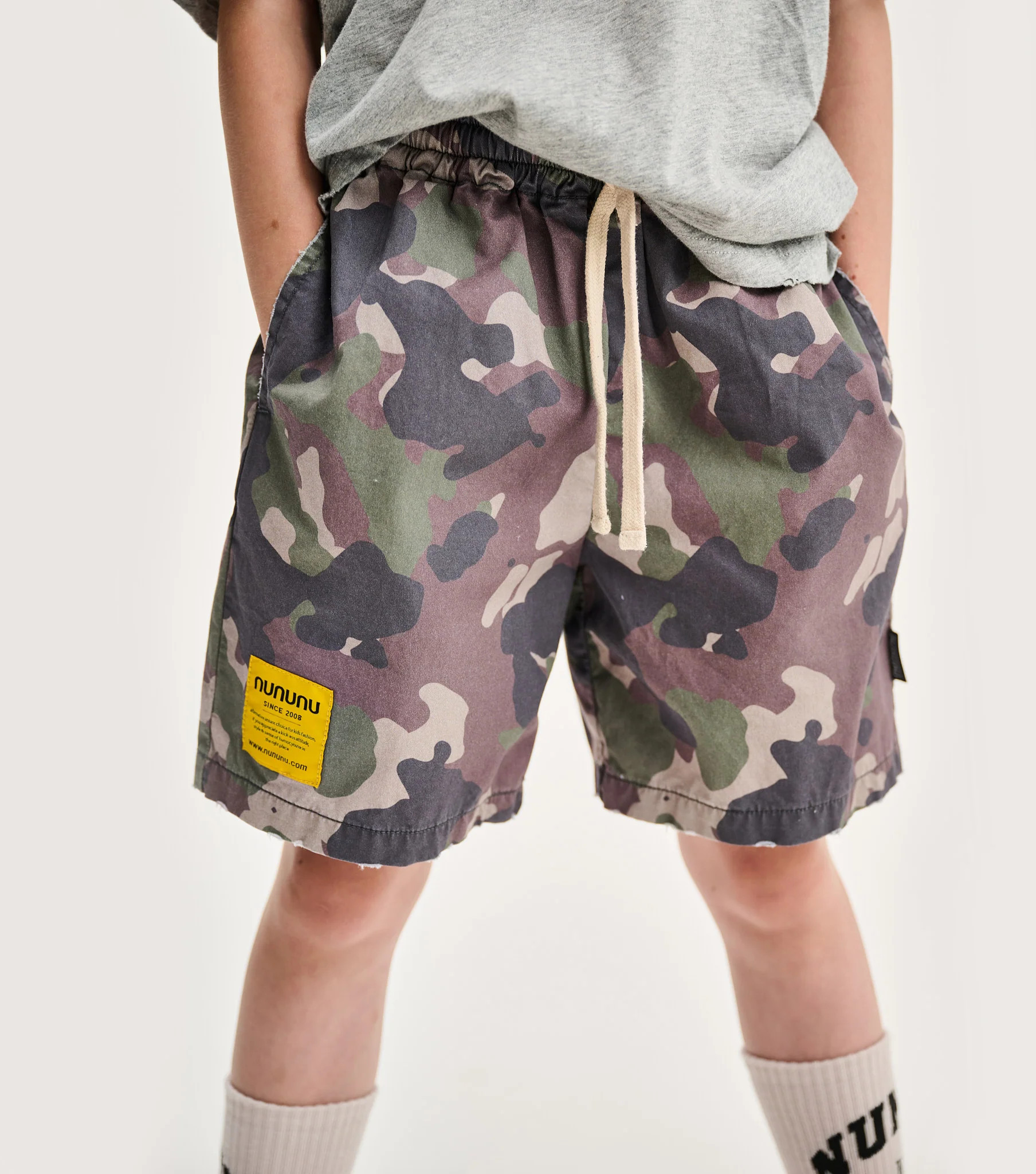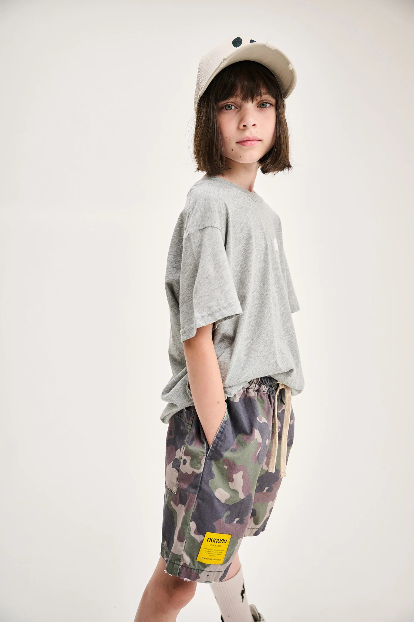 Welcome to the urban jungle—this is your kid’s new uniform. These gender-neutral shorts are made of super light, easy-to-wear drill fabric in full-on camo, complete with custom deconstruction for that lived-in edge. The cinched waistband brings in that comfy sweats vibe, while sleek side pockets and a hidden back pocket make stashing contraband snacks totally low-key. And of course, a bold yellow label adds the perfect pop of color—so you can still spot your kid even when they’re trying to blend in. Whether they’re dodging responsibilities or dominating hide & seek, this is the ultimate look.