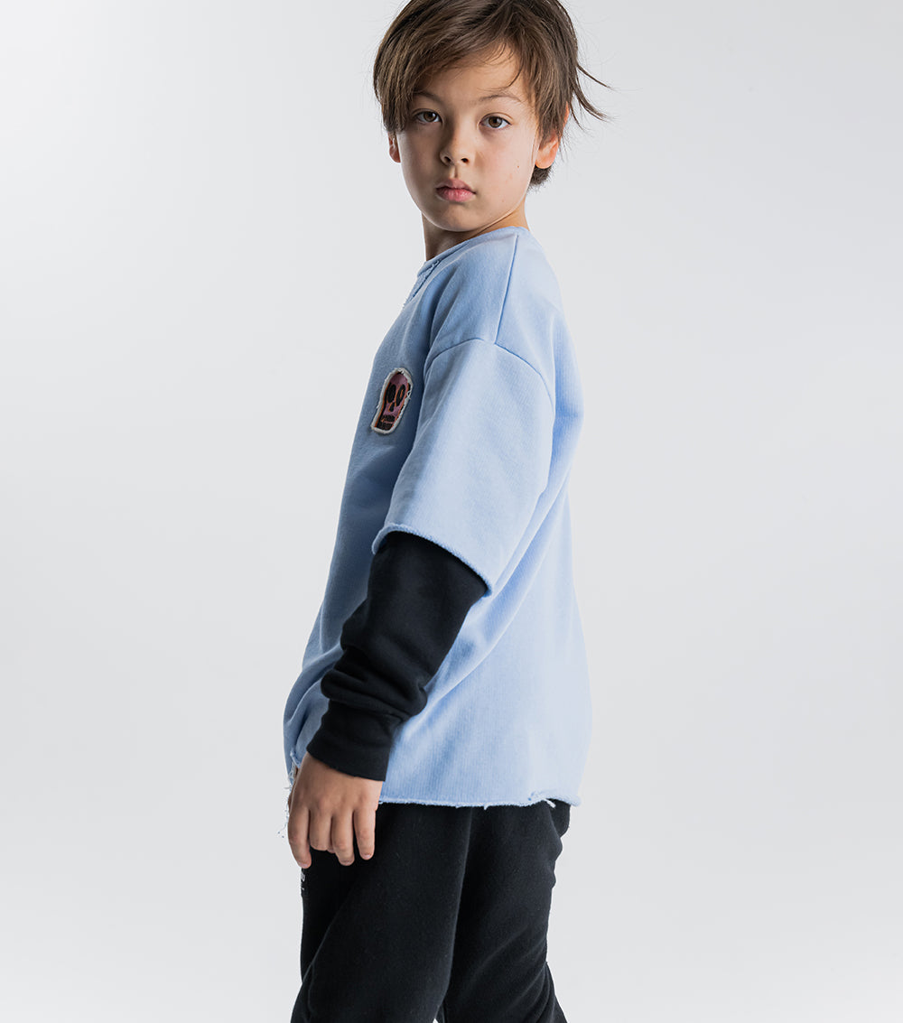 When your kid is too busy causing too much trouble to care, this foggy blue twofer sweatshirt for boys & girls is exactly what they’ll wanna wear. With sleeves made out of cozy ribbed cotton it's comfy but still has that raw grungy look on the hems that we just can’t resist. Created by artist shay id alony, the dizzy skull embroidered patch takes the fun up a notch. At the same time, the bubbly nununu print up the arm offers a pop of white to keep things extra interesting.