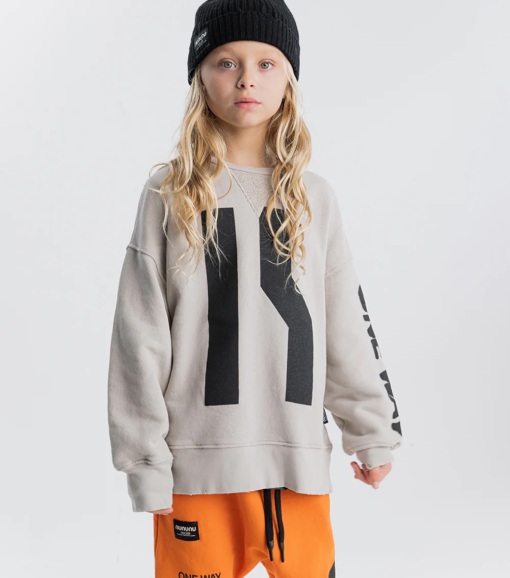 Kids rocking this sweatshirt come in fast & furious. That’s what this black merge print means to us. Its basically a smokey grey gender neutral crewneck sweatshirt, that’s bigger and bolder than you’re used to. Of course it’s crazy comfortable, made of super soft french terry and grunged up with dropped seam sleeves, custom deconstructed hems, and a towel-y v-stitch at the neckline. Loud & clear in a print that looks spray painted on, the left sleeve lets the world know there’s only “one way.” And that is the nununu kid’s way.