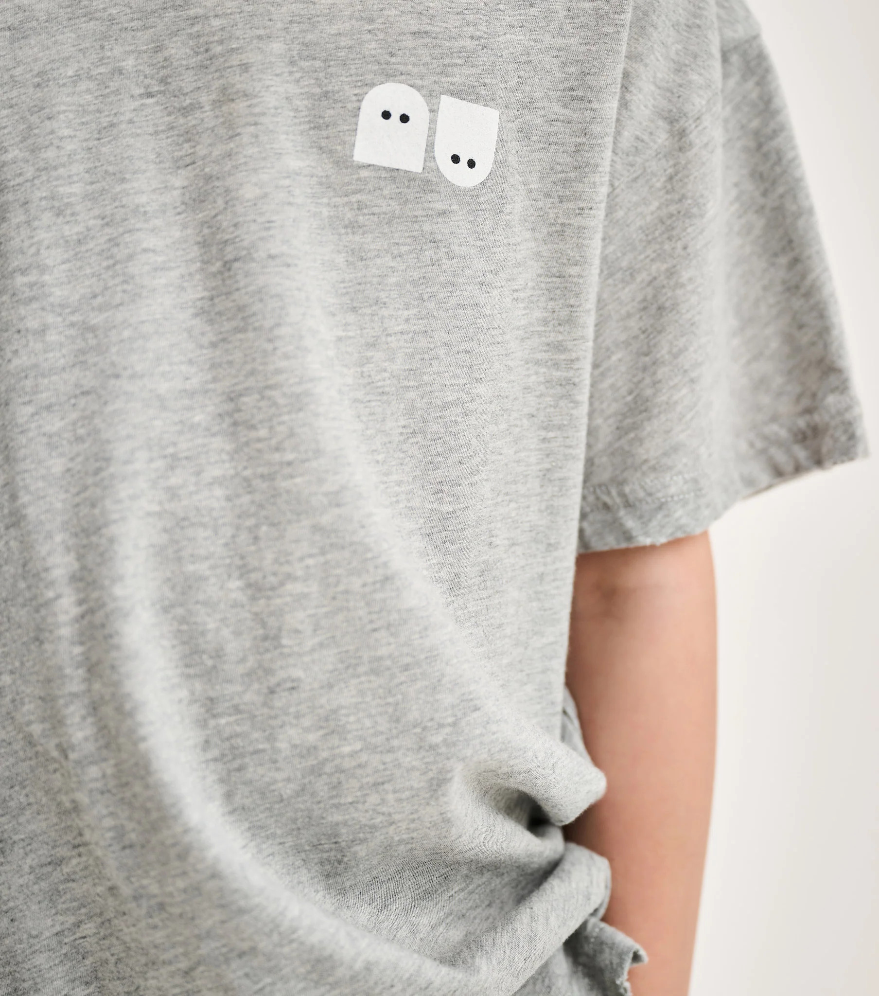 This tee is so cool, it’s one of those pieces we kinda wish came in our size too. Made of heather grey single cotton in a gender-neutral cut, it’s super chill for everyday wear. The raw hem in the back and custom deconstruction details on the front give it that effortlessly cool vibe. Up front, you’ve got two tiny spookies, while the back rocks two big ones—so your kid’s always ready to scare off any monsters hiding under the bed. Yup, it’s totally boo-tiful.