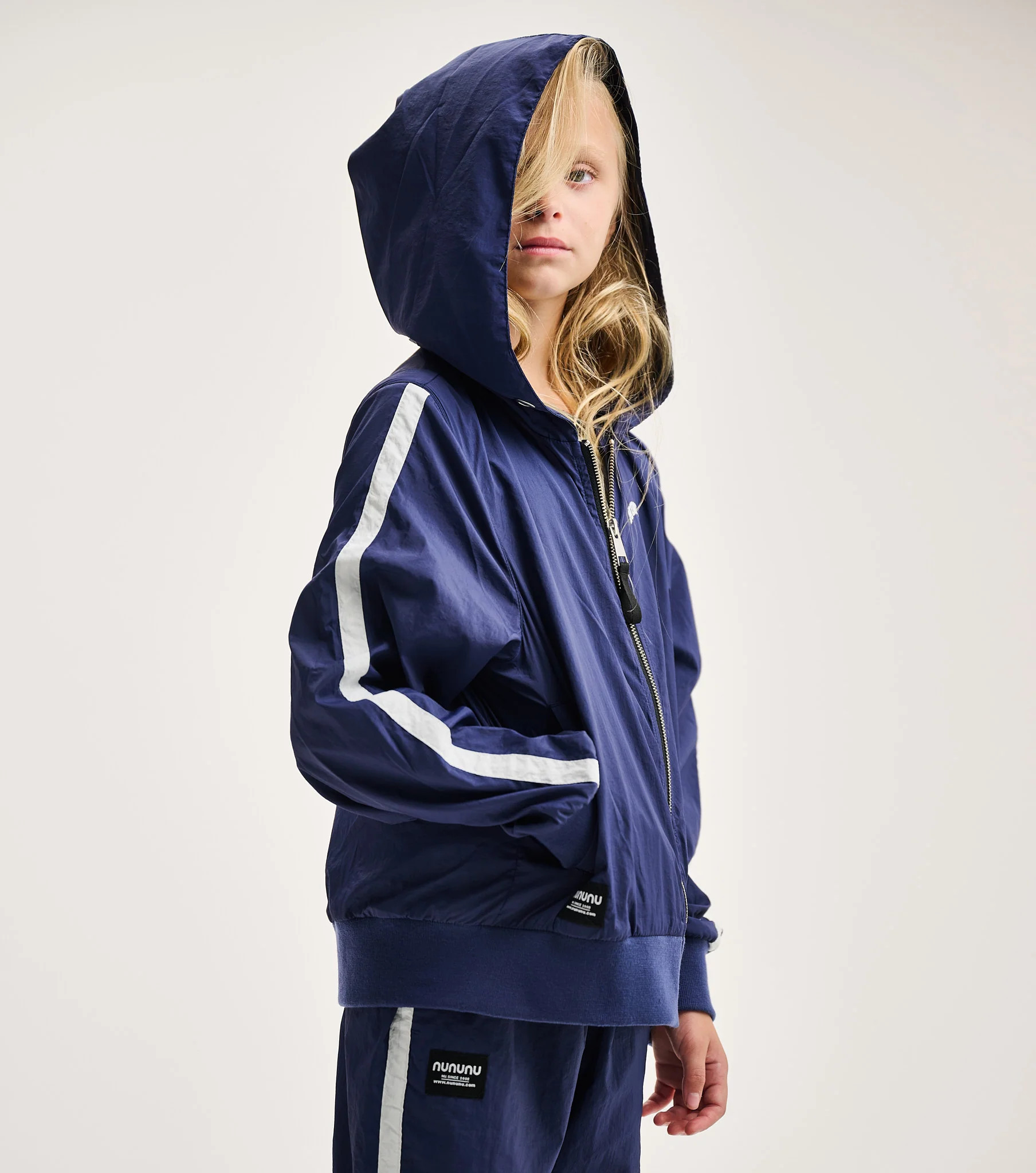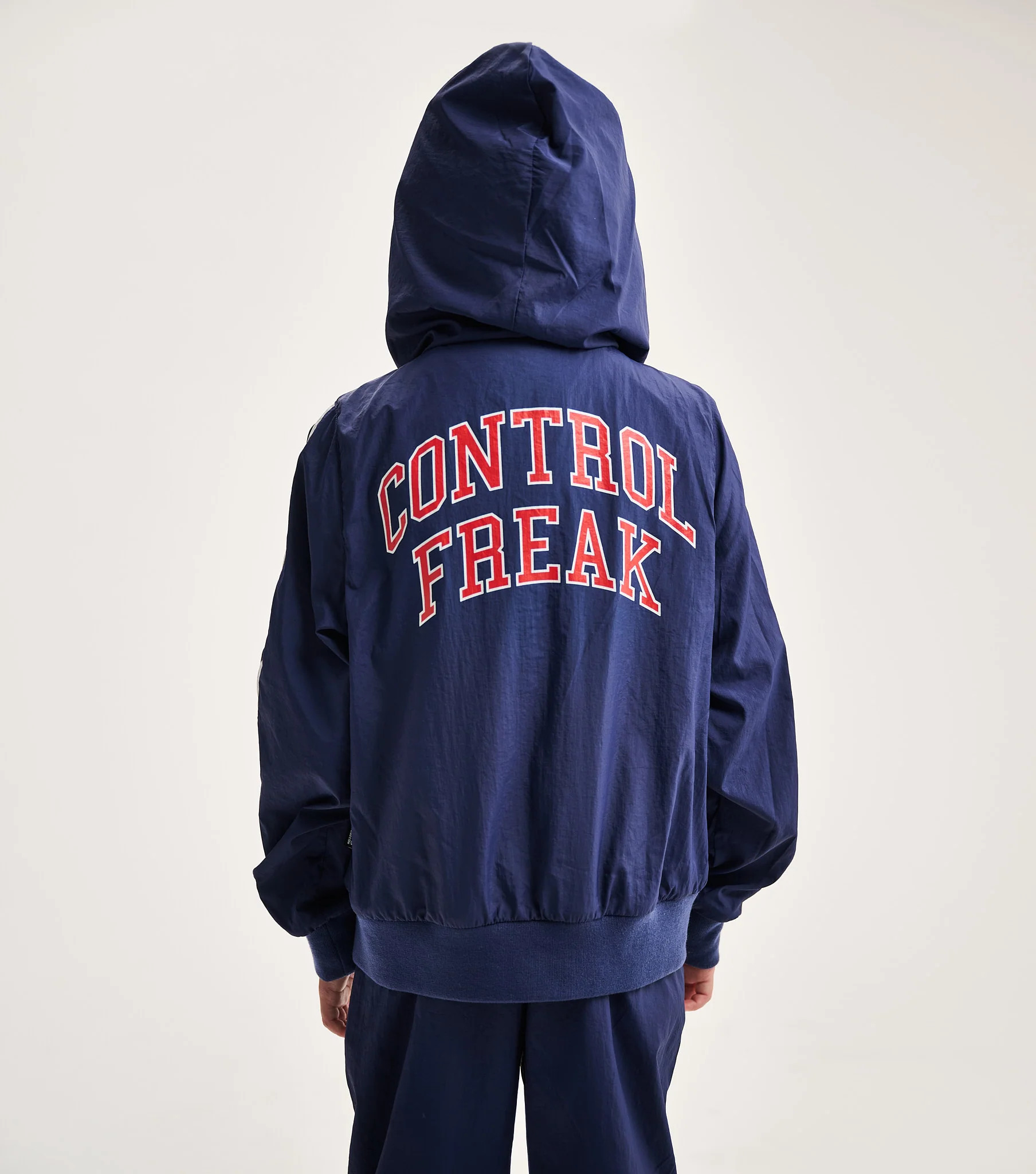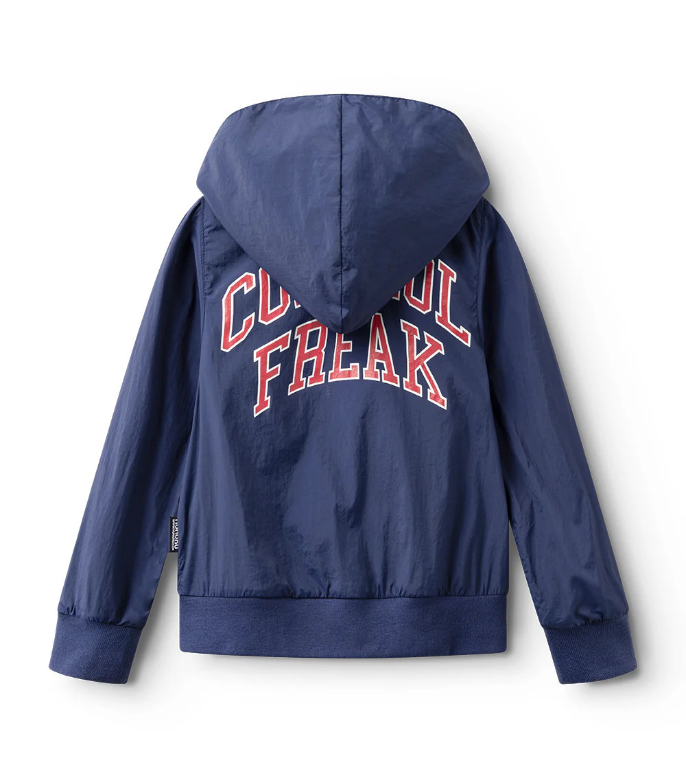Windy days have nothing on the kid with a personality powerful enough to bring on the sunshine. And this indigo light windbreaker jacket is the perfect place for your little weather bender to start. Designed in a gender-neutral cut, it features indigo nylon with a bold white stripe racing up each sleeve and a sleek black full-length zip. To amp up the cool factor, our logo appears on the chest in a university-inspired font. Turn around, and CONTROL FREAK is printed big and bold across the back in red collegiate-style letters outlined in white. A roomy hood, side pockets, and ribbed cuffs and hem make it as comfy as it is iconic.