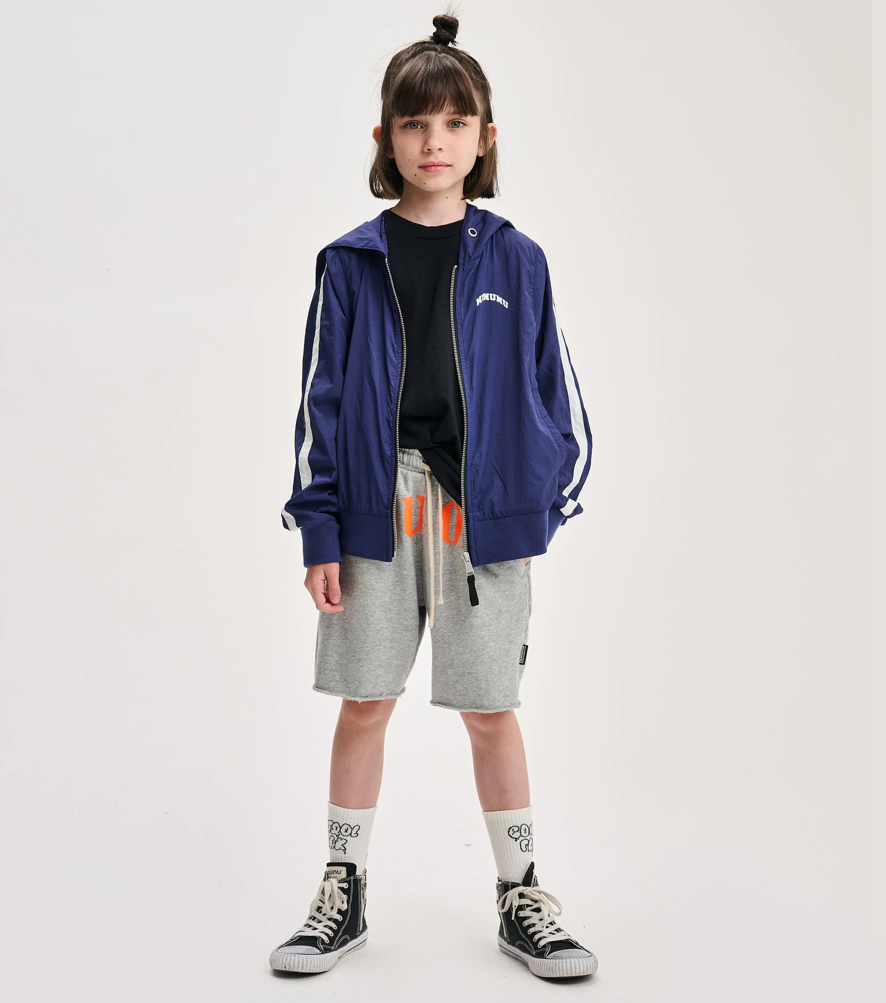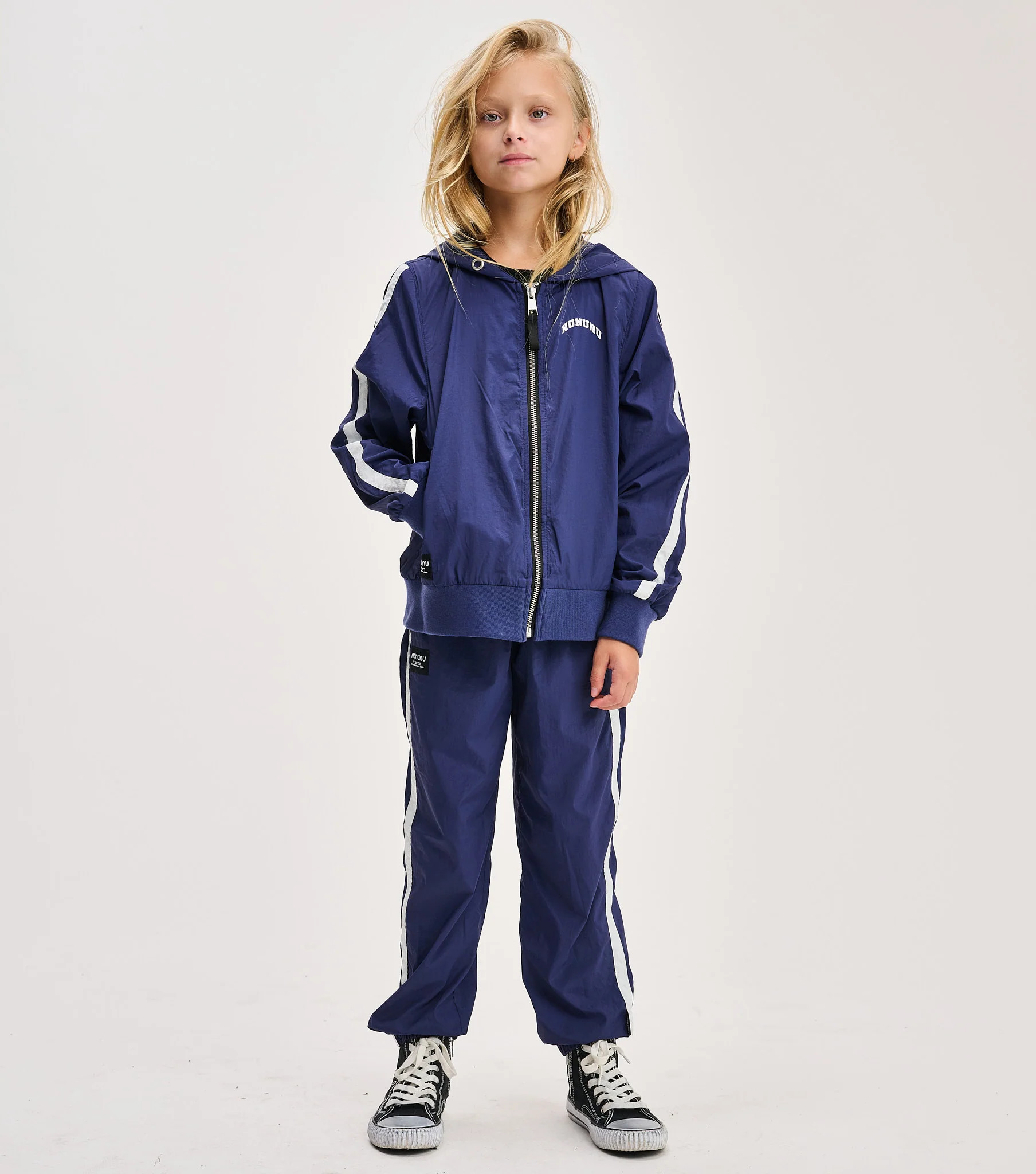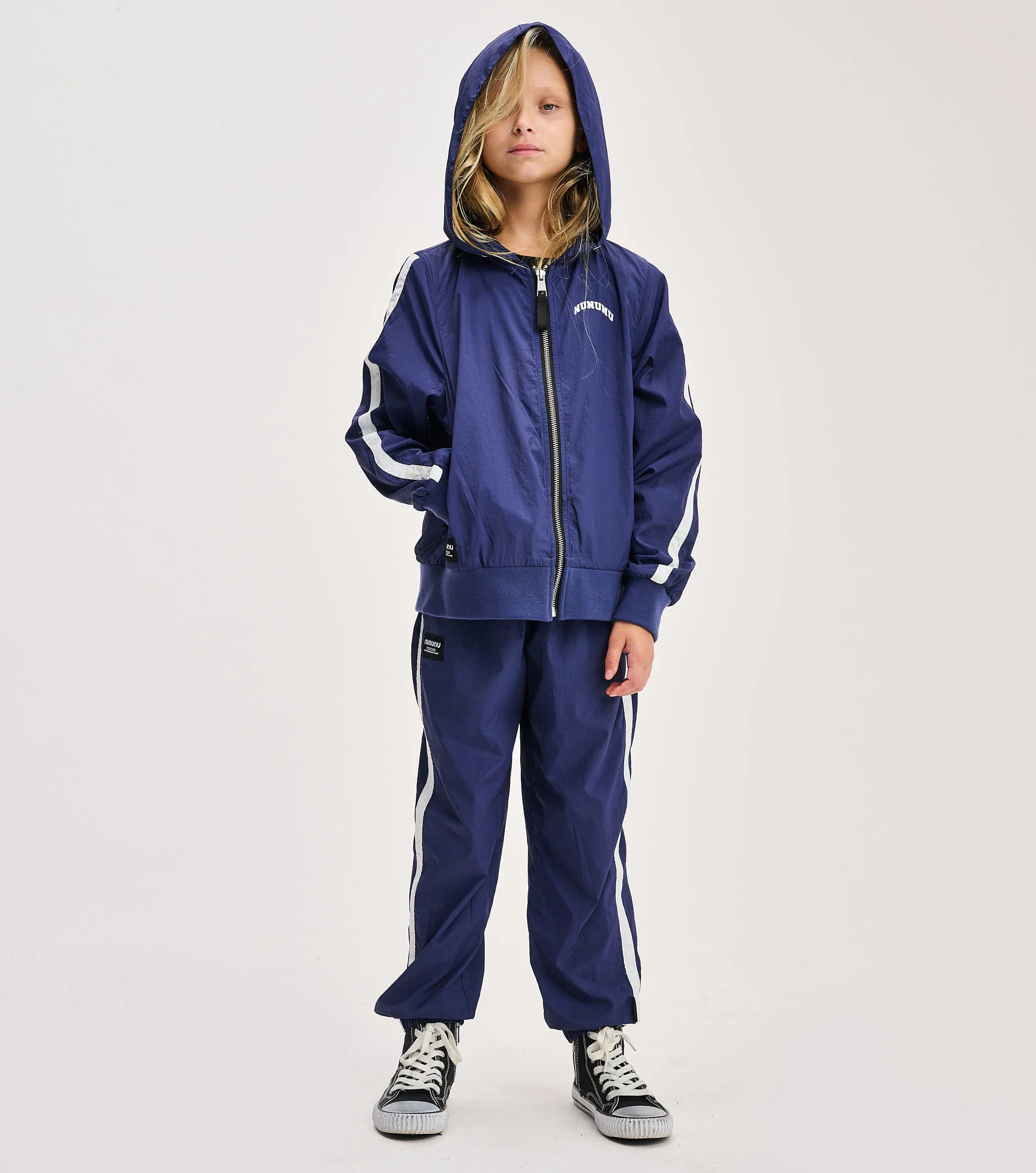 Windy days have nothing on the kid with a personality powerful enough to bring on the sunshine. And this indigo light windbreaker jacket is the perfect place for your little weather bender to start. Designed in a gender-neutral cut, it features indigo nylon with a bold white stripe racing up each sleeve and a sleek black full-length zip. To amp up the cool factor, our logo appears on the chest in a university-inspired font. Turn around, and CONTROL FREAK is printed big and bold across the back in red collegiate-style letters outlined in white. A roomy hood, side pockets, and ribbed cuffs and hem make it as comfy as it is iconic.