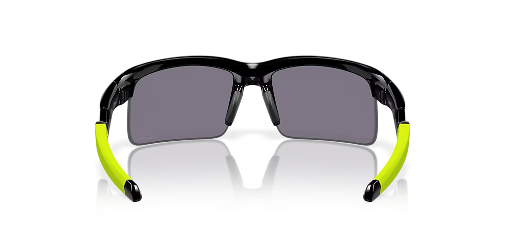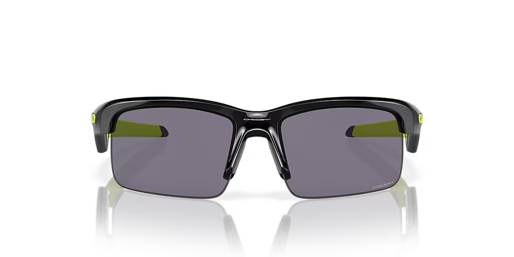 Oakley Capacitor (Youth Fit) sunglasses feature a polished black frame and prizm grey lens, designed with a youth fit for children. The rectangle-shaped lenses provide optimal coverage while maintaining an approachable style. Crafted from o matter material, these shades offer both comfort and durability for long-lasting wear.