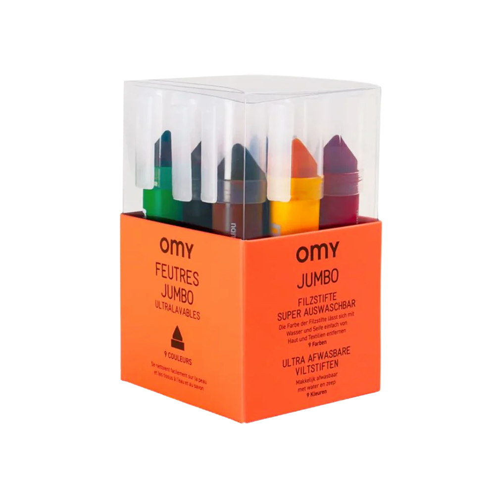 Jumbo markers for mini kids! 9 markers easy told hold with giant tips, perfect for coloring and drawing on large surfaces (line thickness: 2 - 12 mm) Washable ink that doesn’t stain hands or clothes. Conveniently, the box transforms into a marker holder!