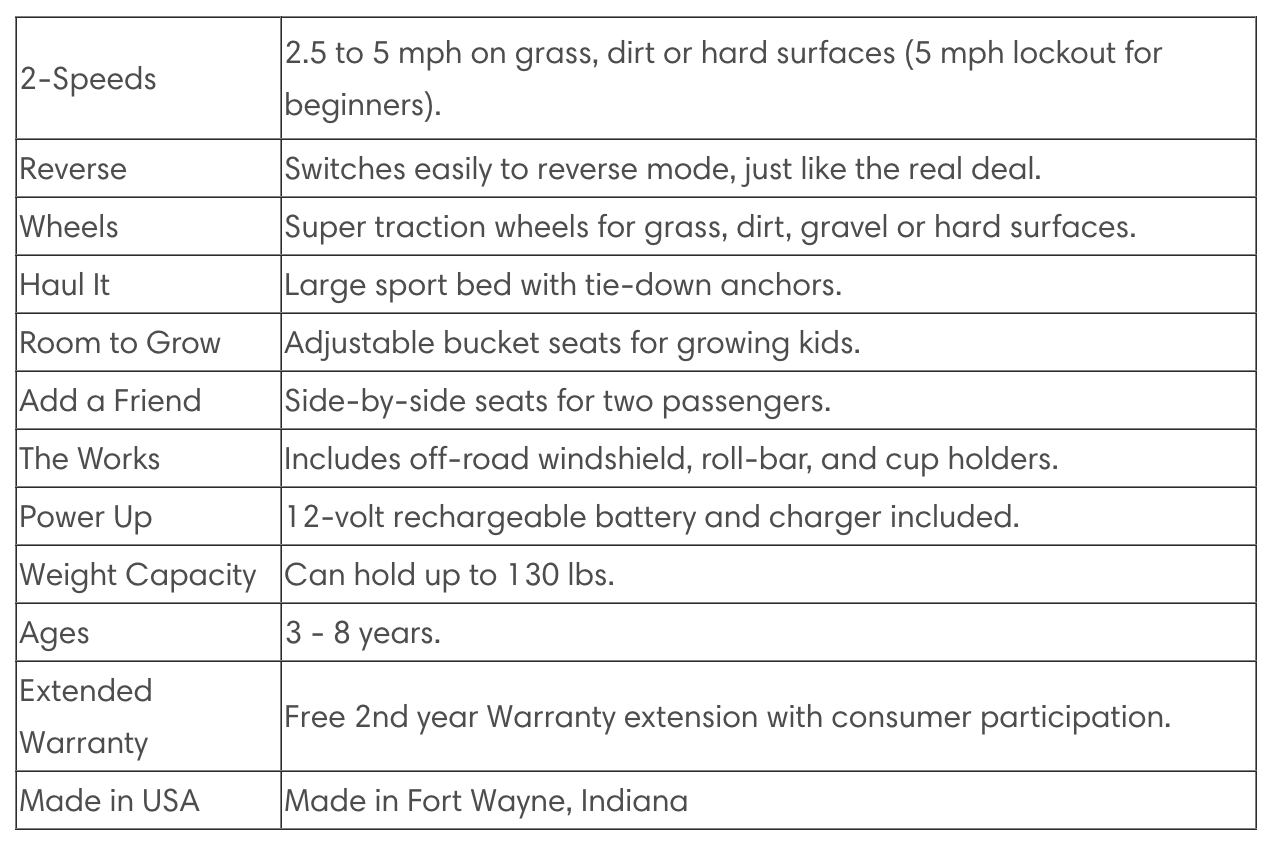 The horn really does beep and the START button switches on the roaring engine sound and the lights. A LED light indicates how charged the battery is, so you can keep your child’s play under control. A handy passenger handle makes for safe off-road trips!