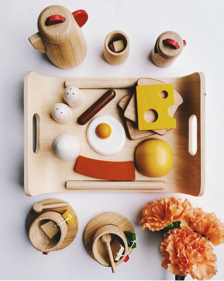 Your little one will love serving up a delicious breakfast for you with this menu set, featuring everything from bacon to boiled eggs. The set includes 2 slices of bread, a bun, sausage, bacon, cheese, fried egg, boiled egg, salt, and pepper that are served on a tray.