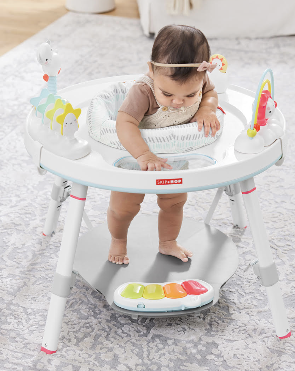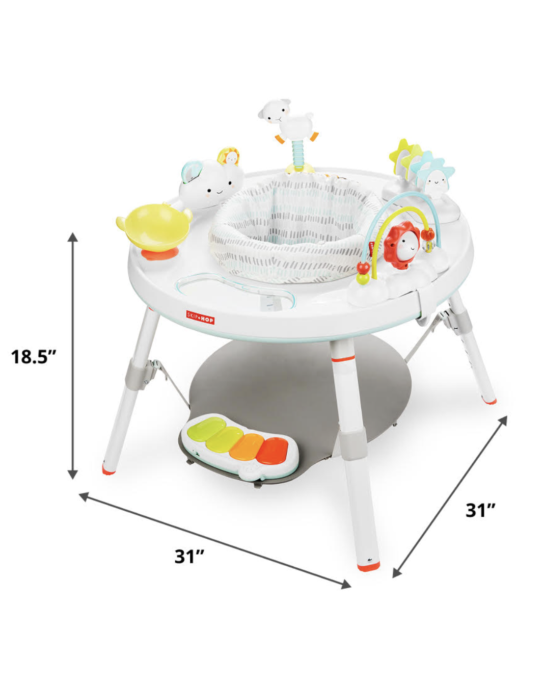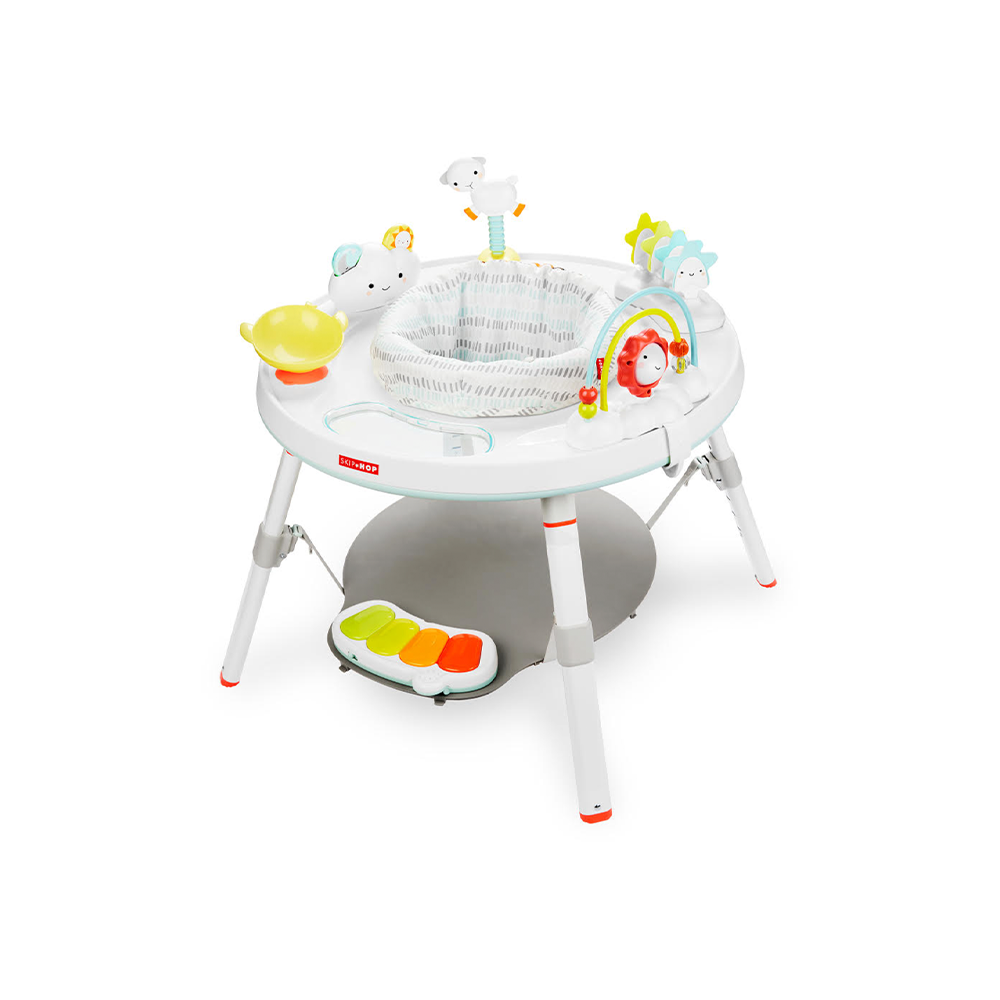 Designed to grow with baby in three stages, our baby activity center is an action-packed take on our best-selling Silver Lining Cloud gym. Featuring the same developmental approach to play and learning as our Explore & More™ activity center, the décor-friendly design features a 360- degree rotating seat for baby to swivel and play. Our unique Discovery Window gives little ones a clear view of their feet as they play the light-up piano to connect cause and effect. Four dreamy toys can be rearranged for customized play. As baby grows, the activity center converts for easy cruising. At stage three, it transforms into a sturdy toddler table with a plastic chalkboard surface for drawing, playing—the sky's the limit!