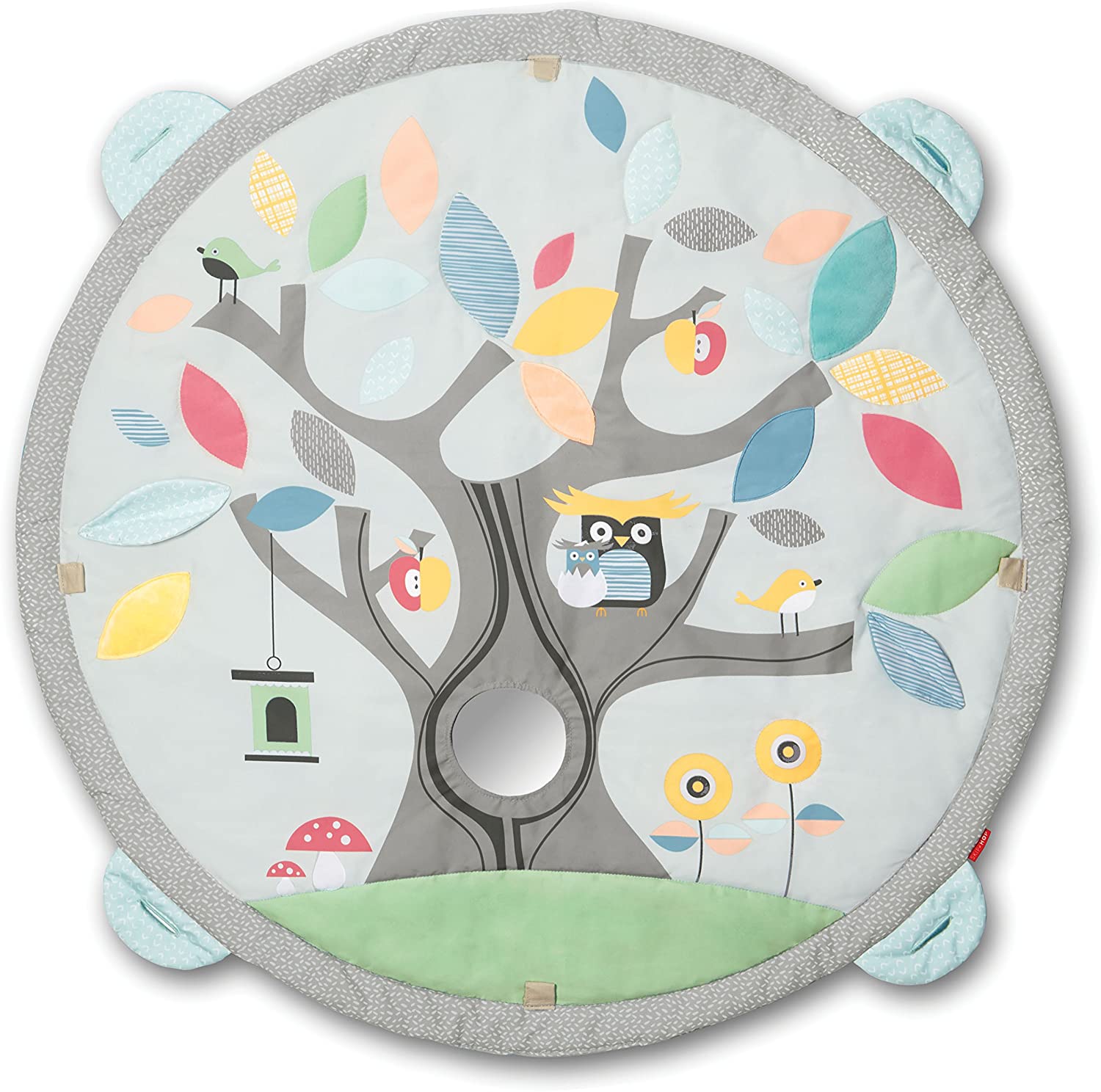 - Multiple fabrics plus activities on the mat: crinkle leaves, squeaker flower and baby-safe mirror in the tree trunk (mirror is removable for machine-washing)