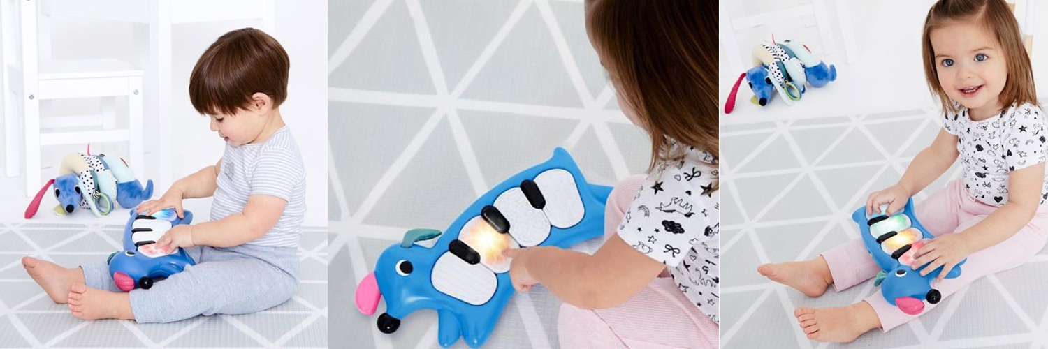 Colorful lights and music add a bright note to playtime! This cute pup inspires early musical creativity with cheerful tunes, notes and barks. Textured, light-up keys and an iridescent fabric ear encourage tactile and visual exploration. An angled base makes it easy to play when baby is learning to sit. Let the concert begin!