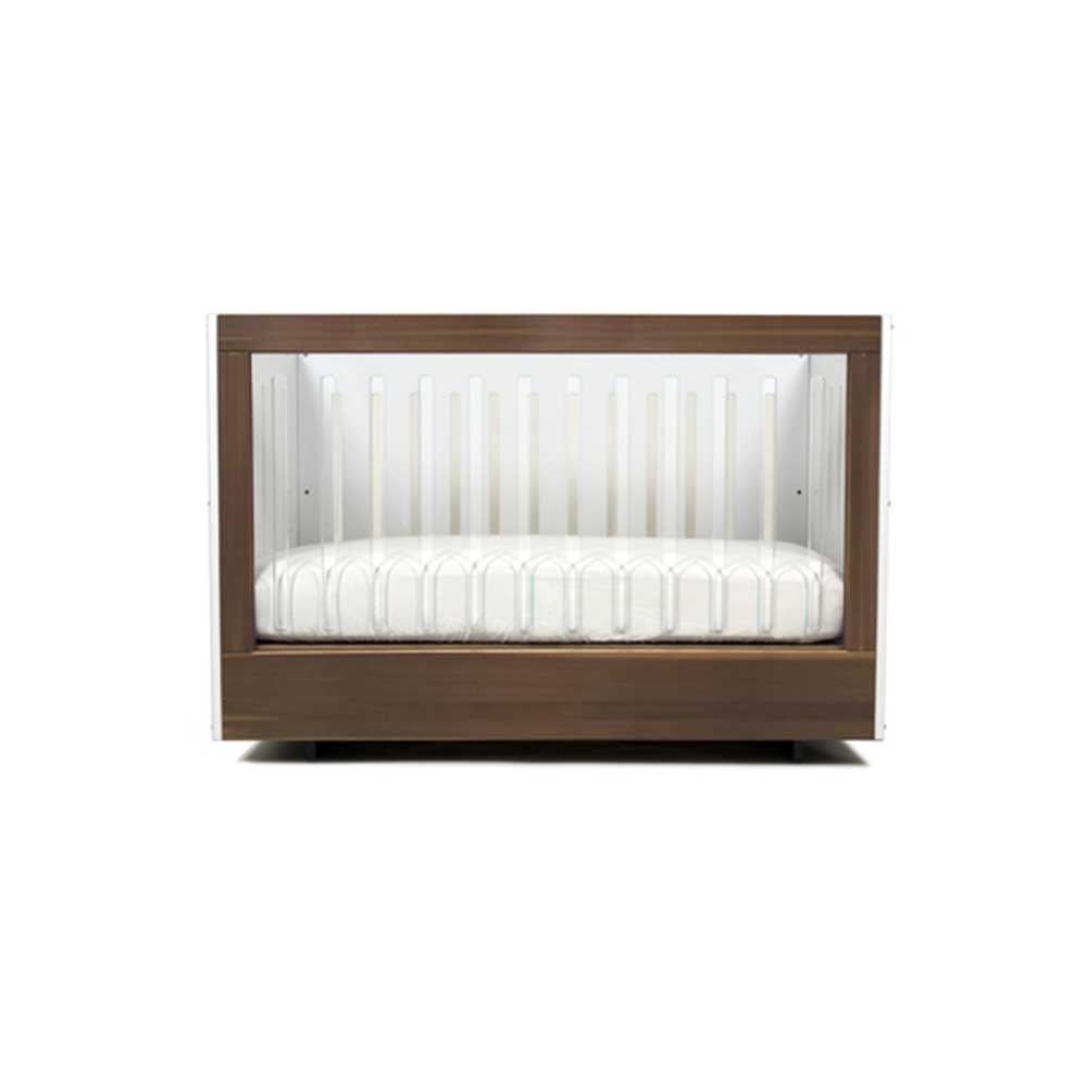 - Product Dimensions: 30”D 53.5”W 36”H, 150 lbs- For use with standard size crib mattress (28"D 52"W 6"H). Mattress not included.- Sides, base and platform birch construction. End panels Eco-MDF.- Product ships in approximately 2 weeks.- Mattress has 3 adjustable positions.- Toddler bed conversion available.- Available in your choice of 1-side acrylic or 2-side acrylic.- The acrylic slats measure 3” across and the spacing between is 1”.