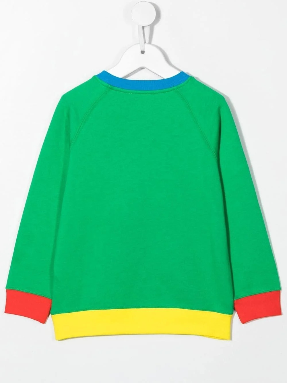 Color-block logo sweatshirt from STELLA MCCARTNEY KIDS featuring organic cotton, colour-block design, jersey knit, logo print to the front, crew neck, long sleeves, ribbed cuffs, straight hem and royal blue/multicolour.