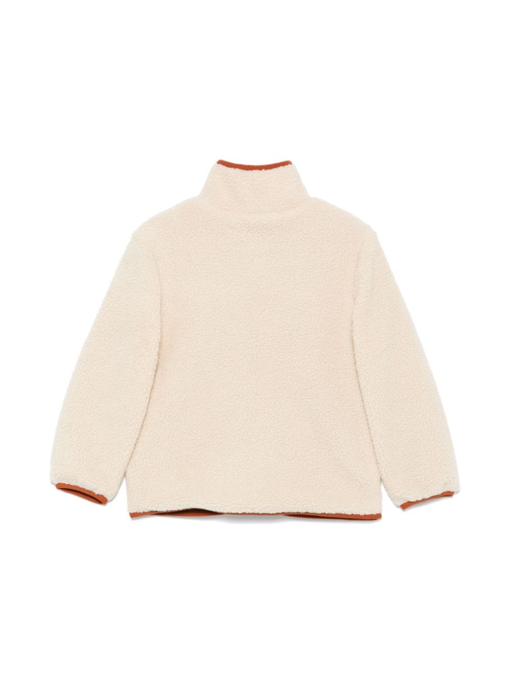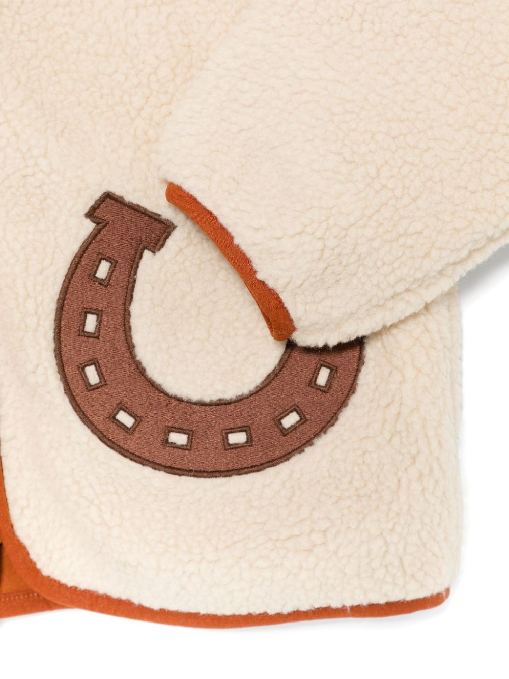 This playful Stella McCartney Teddy Jacket blends warmth with a fun cowboy aesthetic. Made from 100% recycled polyester faux shearling in beige and brown, it features charming horse-appliqué patches and a star badge for a sheriff-inspired look. The cotton lining ensures comfort, while the zip fastening and high neck provide extra warmth for colder days.