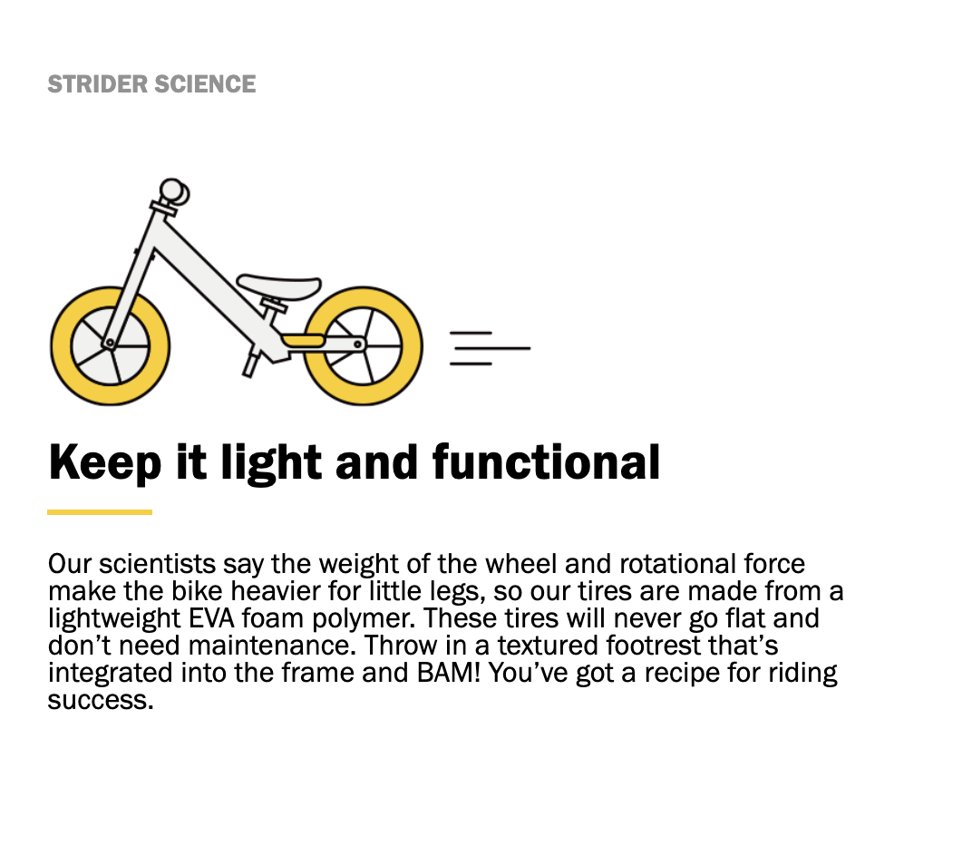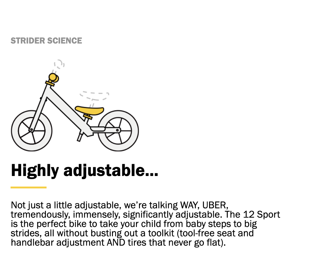 Boring specs aside, this is the bike that introduces kids to the freedom, power, and responsibility of riding. Now they have the power to keep up with you when you’re out and about. No more strollers. No more of those ridiculous kid leashes. Your child can experience the truly amazing freedom that comes with being a part of the Strider family.