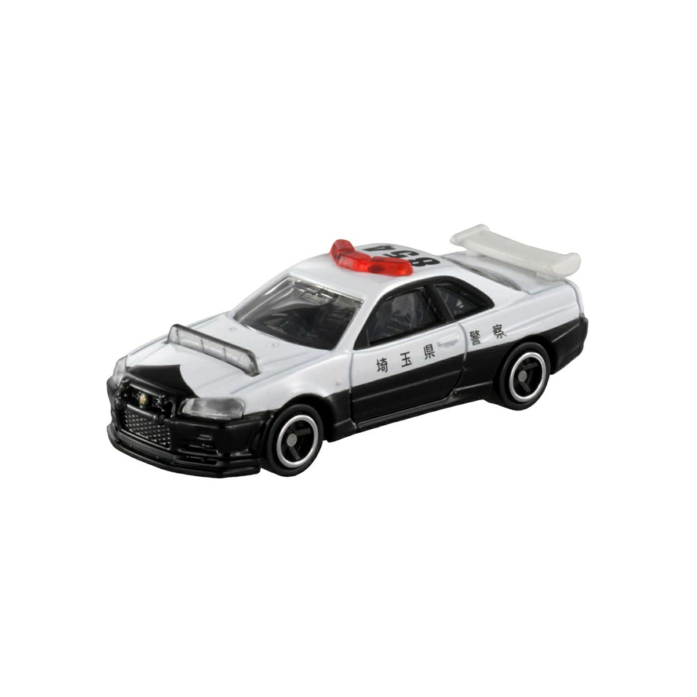 A detailed die-cast model of a Japanese GT-R police car from the Tomica No.1 series.