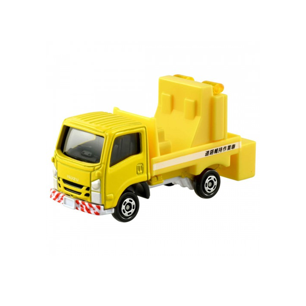 A compact die-cast replica of the Isuzu Elf, styled as a bright yellow road maintenance vehicle.