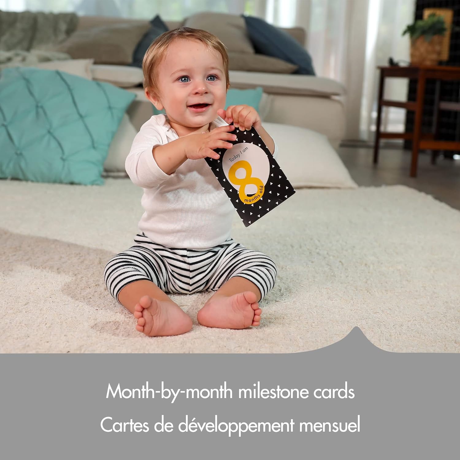 The 5-in-1 Here I Grow Stationary Baby Activity Center comes with a complimentary set of month-by-month milestone cards - a wonderful way to create adorable keepsakes that celebrate your baby's growth. Simply flip the card to discover a useful tip that will help you learn more about your baby's development at that stage.