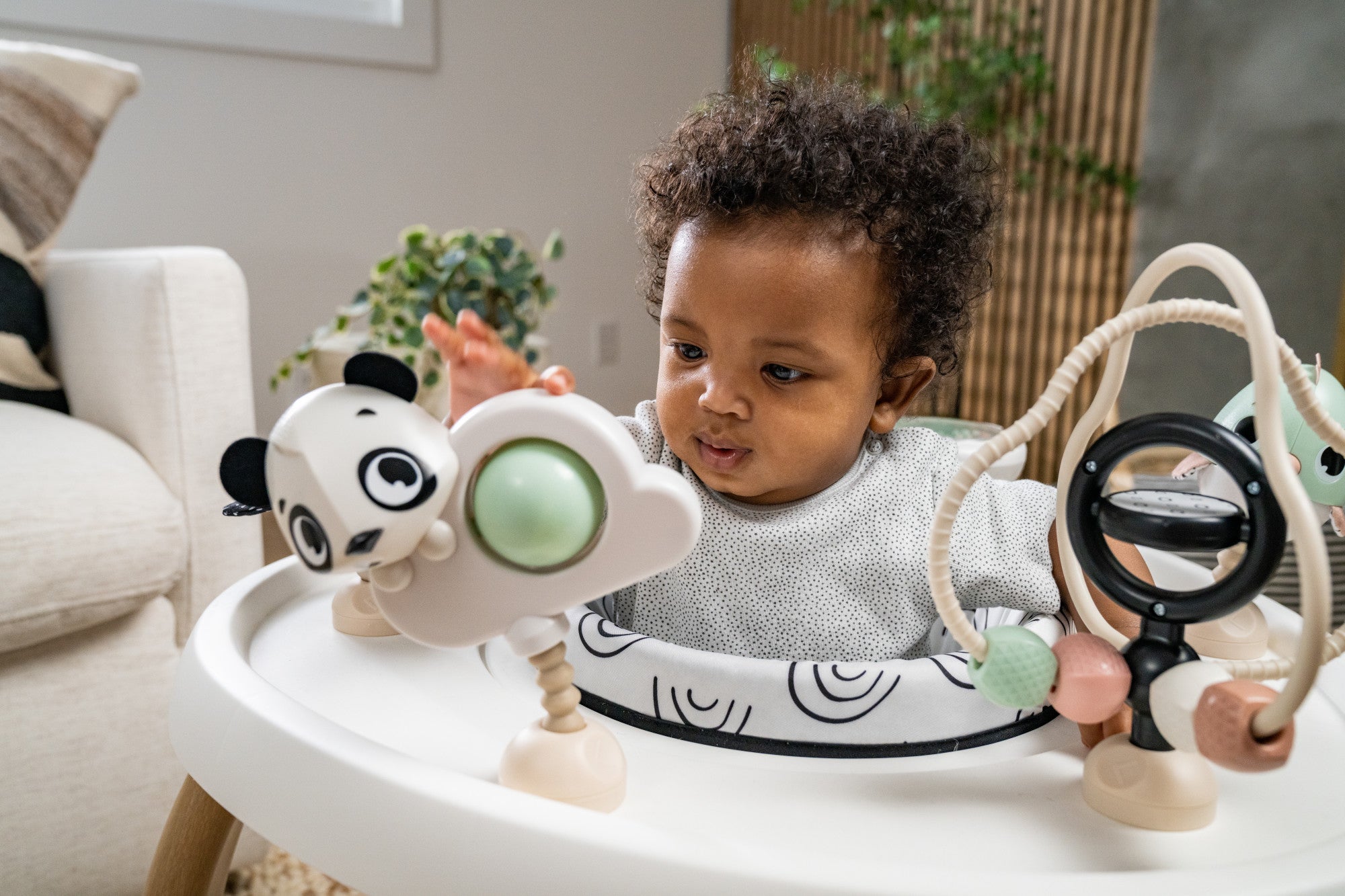 A 360-degree rotating seat allows baby to fully explore their surroundings and be part of the action. Plus, baby will always be entertained with 6 developmental toys and more than 21 activities to keep them engaged! The playful beads maze with rotating mirror help develop social & emotional connections by drawing the baby's attention to their own reflection while the crinkle multi-textures lily toy stimulates your baby's senses.