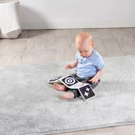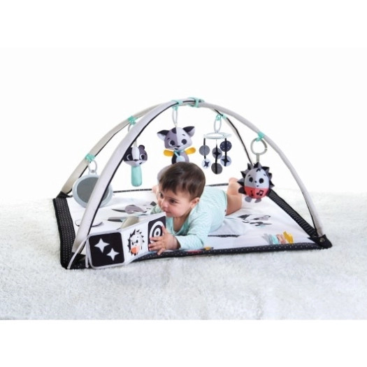 The Magical Tales Black & White Gymini is a stylish activity gym, designed especially to support newborn development. With 18 developmental activities and interactive toys, it encourages baby’s skills as they naturally play. Its contrasting black and white details provide visual stimulation for newborns. The adjustable arches can be easily arranged in a variety of ways, or removed, to enhance your baby’s developmental environment for the ultimate tummy time experience. Let your little one explore the shapes on the soft black and white book or marvel at their own reflection in the mirror while practicing tummy time. The spacious and cozy play area let’s babies stretch and experiment with movement and roll over. The playmat's variety of textures, sounds and features provide ongoing auditory and tactile stimulation. Through interactive play with the musical hedgehog, playful plush cloud, wind chime badger and crinkly peek-a-boo tree, your baby can develop cognitive skills such as “cause ‘n effect” and object permanence. With the help of our developmental experts we made sure every tiny detail will encourage your newborn to explore and develop.