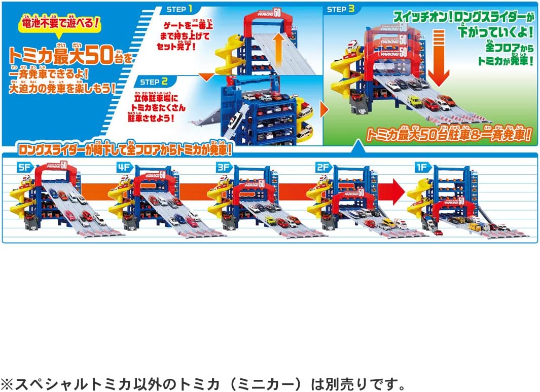 Slider Parking 50: Elevate your Tomica experience with a 5-story parking lot featuring an automatic long slider for simultaneous movement of 50 cars. Includes a special Honda Civic Type R.